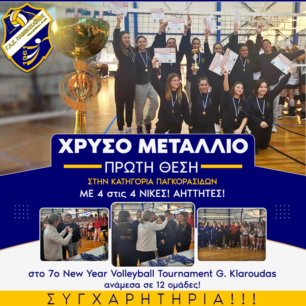 Σπουδαία διάκριση κατήγαγαν οι κορασίδες του Παμβοχαϊκού στο 7ο New Year Volleyball Tournament G. Klaroudas που ολοκληρώθηκε σήμερα Πέμπτη 5 Ιανουαρίου 2023. Τα κορίτσια του Παμβοχαϊκού ανάμεσα σε 12 ομάδες κατάφεραν να κατακτήσουν την πρώτη θέση και το χρυσό μετάλλιο, ολοκληρώνοντας μάλιστα τις υποχρεώσεις τους αήττητες με 4 στις 4 νίκες!