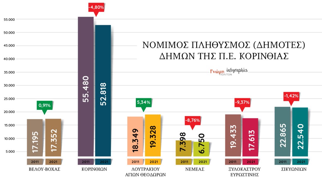 Στην Π.Ε. Κορινθίας όπως φαίνεται από το γράφηµα, τους 20.000 κατοίκους ξεπερνούν µόνον ο δήµος Κορινθίων και ο δήµος Σικυωνίων. Μάλιστα, µε δεδοµένη την µείωση πληθυσµού, η οποία ήταν αναµενόµενη για όλη την χώρα, στον δήµο Σικυωνίων δόθηκε πραγµατική µάχη για να επιτευχθεί το πολυπόθητο νούµερο, άνω των 20.000 κατοίκων. Θυµίζουµε µόνον την µακρά καµπάνια προώθησης της απογραφής που «έτρεξε» ο δήµος επί µήνες σε όλα τα κοινωνικά δίκτυα µε συνεχείς υπενθυµίσεις προς τους κατοίκους.