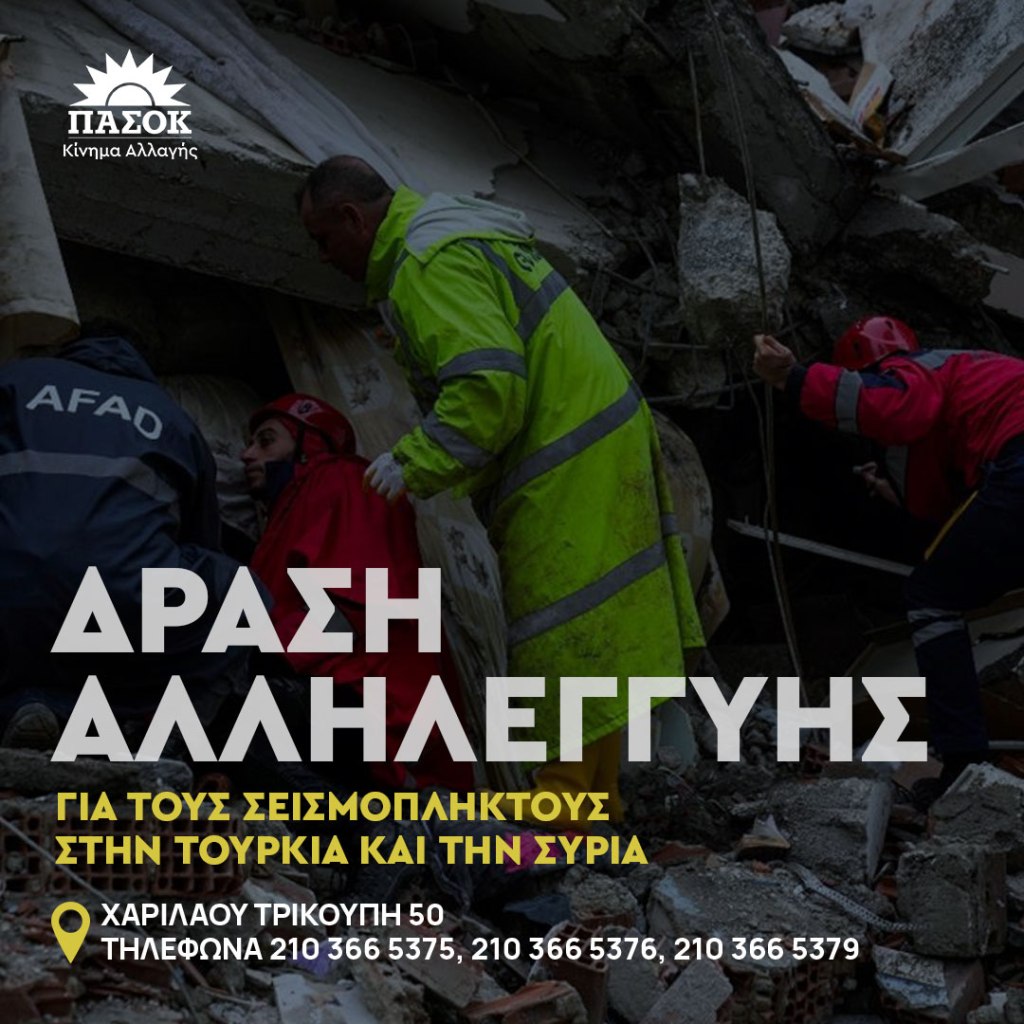 Κάλεσμα στους πολίτες για την συγκέντρωση ανθρωπιστικής βοήθειας για τους σεισμόπληκτους της Τουρκίας και της Συρίας απευθύνει ο Τομέας Εθελοντισμού και Κοινωνικών Κινημάτων του ΠΑΣΟΚ-Κινήματος Αλλαγής.