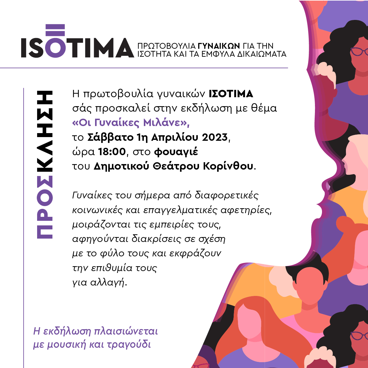 Η πρωτοβουλία γυναικών ΙΣΟΤΙΜΑ διοργανώνει εκδήλωση με θέμα «Οι Γυναίκες Μιλάνε», αύριο Σάββατο 1η Απριλίου 2023, ώρα 18:00, στο φουαγιέ του Δημοτικού Θεάτρου Κορίνθου