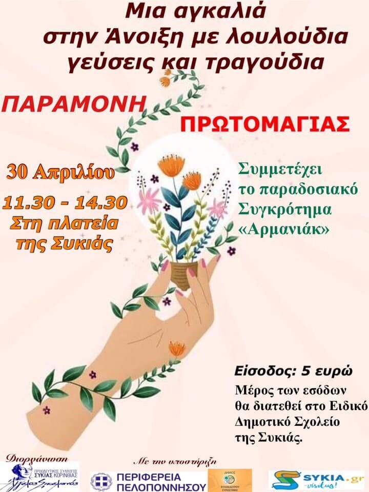 Την Κυριακή 30 Απριλίου 2023 ο Πολιτιστικός Σύλλογος Συκιάς Κορινθίας «Άγγελος Σικελιανός» γιορτάζει στην πλατεία της Συκιάς την Άνοιξη με λουλούδια και τραγούδια!