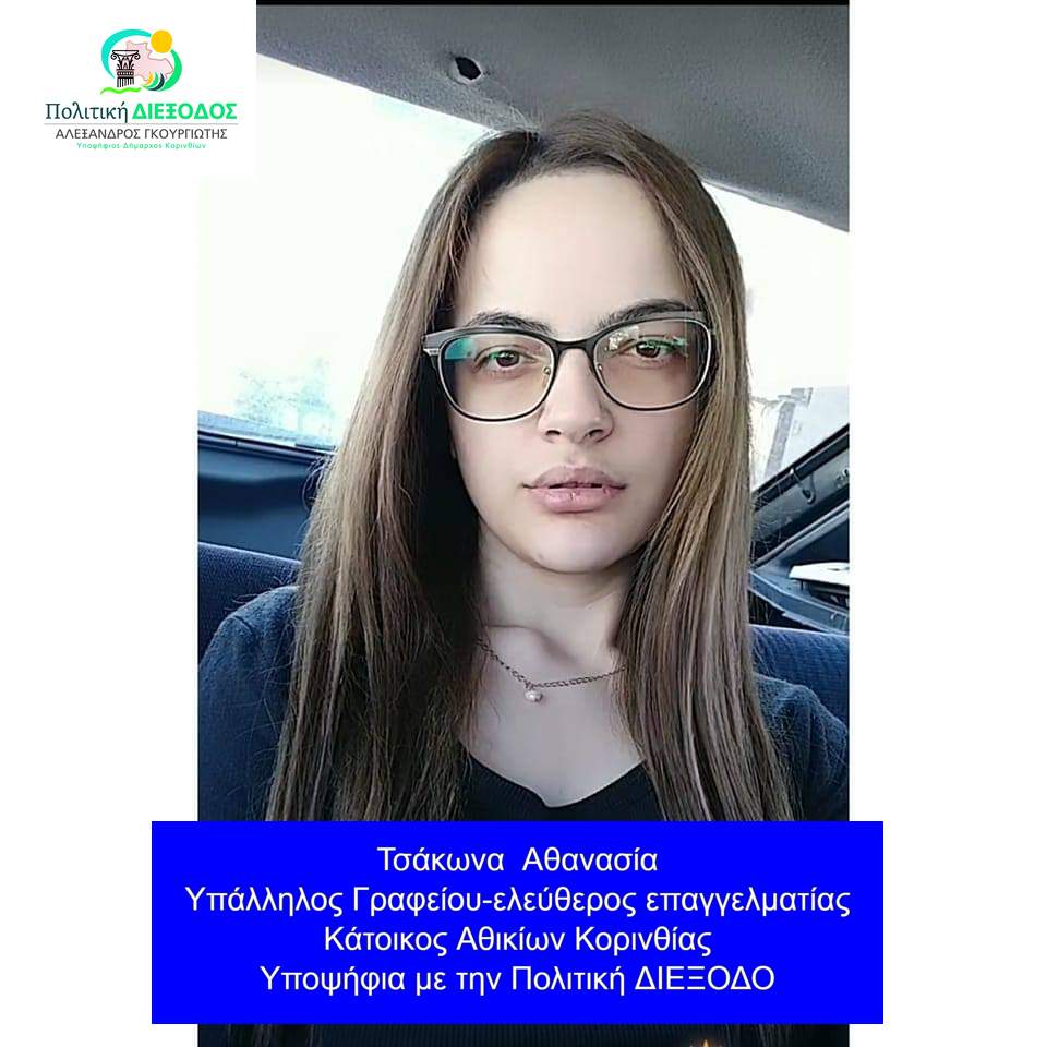 Η κ. Αθανασία Τσάκωνα είναι μόλις 24 ετών και κάτοικος Αθικίων. Έχει αποφοιτήσει από το Μουσικό σχολείο Κορίνθου, εργάζεται ως υπάλληλος γραφείου σε εταιρεία ρεύματος και παράλληλα ως ελεύθερος επαγγελματίας στον τομέα του μακιγιάζ. Είναι μια φωνή ενός νέου ανθρώπου που αγκαλιάζει την συλλογική προσπάθεια της «Πολιτικής ΔΙΕΞΟΔΟΥ» δίνοντας τον παλμό της νέας γενιάς.