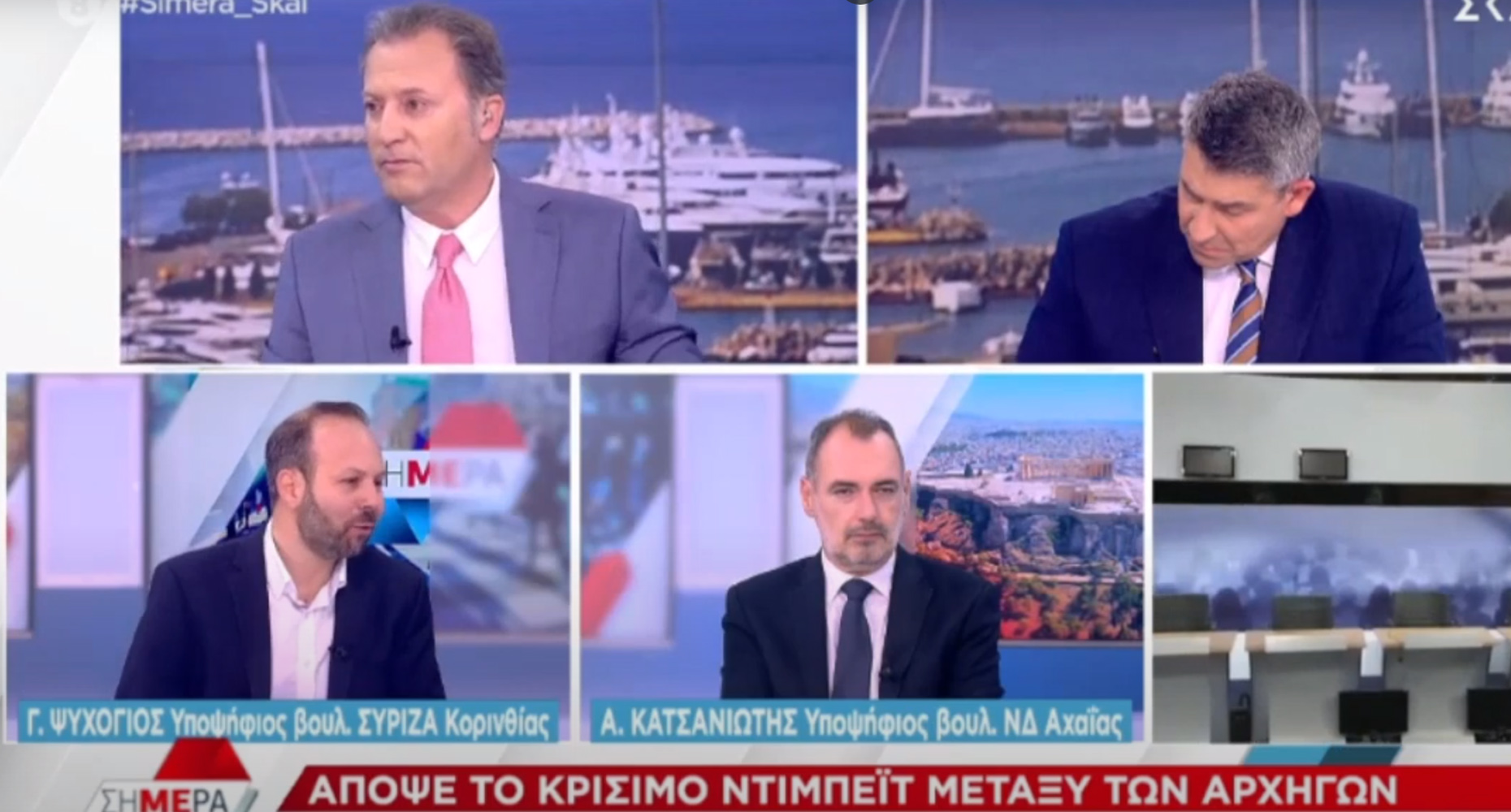 Σημεία από την συνέντευξη που παραχώρησε σήμερα Τετάρτη 10/5/2023 ο υποψήφιος βουλευτής ΣΥΡΙΖΑ –ΠΣ Νομού Κορινθίας, Γιώργος Ψυχογιός, στην τηλεοπτική εκπομπή «ΣΗΜΕΡΑ» του ΣΚΑΪ με τους Δημήτρη Οικονόμου και Άκη Παυλόπουλο και έτερο προσκεκλημένο τον υποψήφιο βουλευτή ΝΔ Αχαΐας, Ανδρέα Κατσανιώτη.