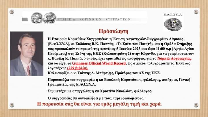 Η Ένωση Λογοτεχνών-Συγγραφέων Λάρισας (Ε. ΛΟ. ΣΥ. Λ) συνεργάζεται με την Εταιρεία Κορίνθιων Συγγραφέων για αυτή την παρουσίαση. Ο κ. Βασίλης Παππάς, κατέχει το Guinness Official World Record ως ο πλέον πολυγραφότατος Έλληνας λογοτέχνης (229 βιβλία ).