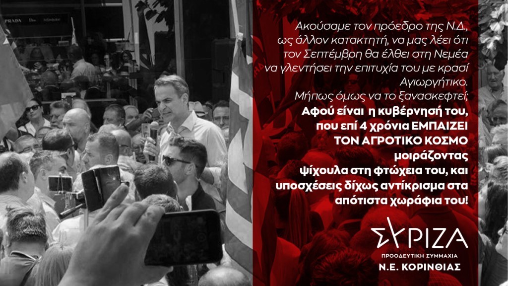 Τέλος, ακούσαμε τον πρόεδρο της Ν.Δ., ως άλλον κατακτητή, να μας λέει ότι τον Σεπτέμβρη θα έλθει στη Νεμέα να γλεντήσει την επιτυχία του με κρασί Αγιωργήτικο. Μήπως όμως να το ξανασκεφτεί, αφού είναι η κυβέρνησή του, που επί 4 χρόνια εμπαίζει τον αγροτικό κόσμο μοιράζοντας ψίχουλα στη φτώχεια του, και υποσχέσεις δίχως αντίκρισμα στα απότιστα χωράφια του!».