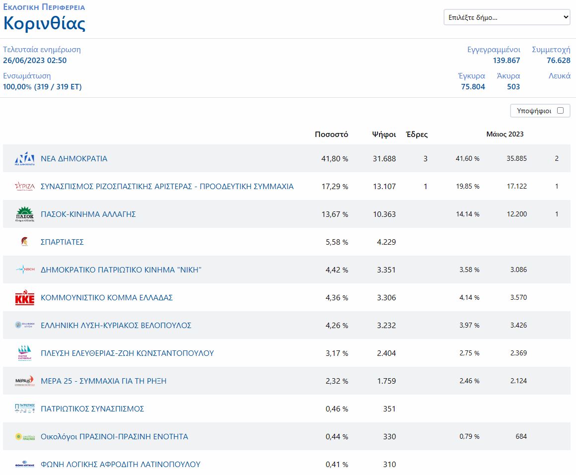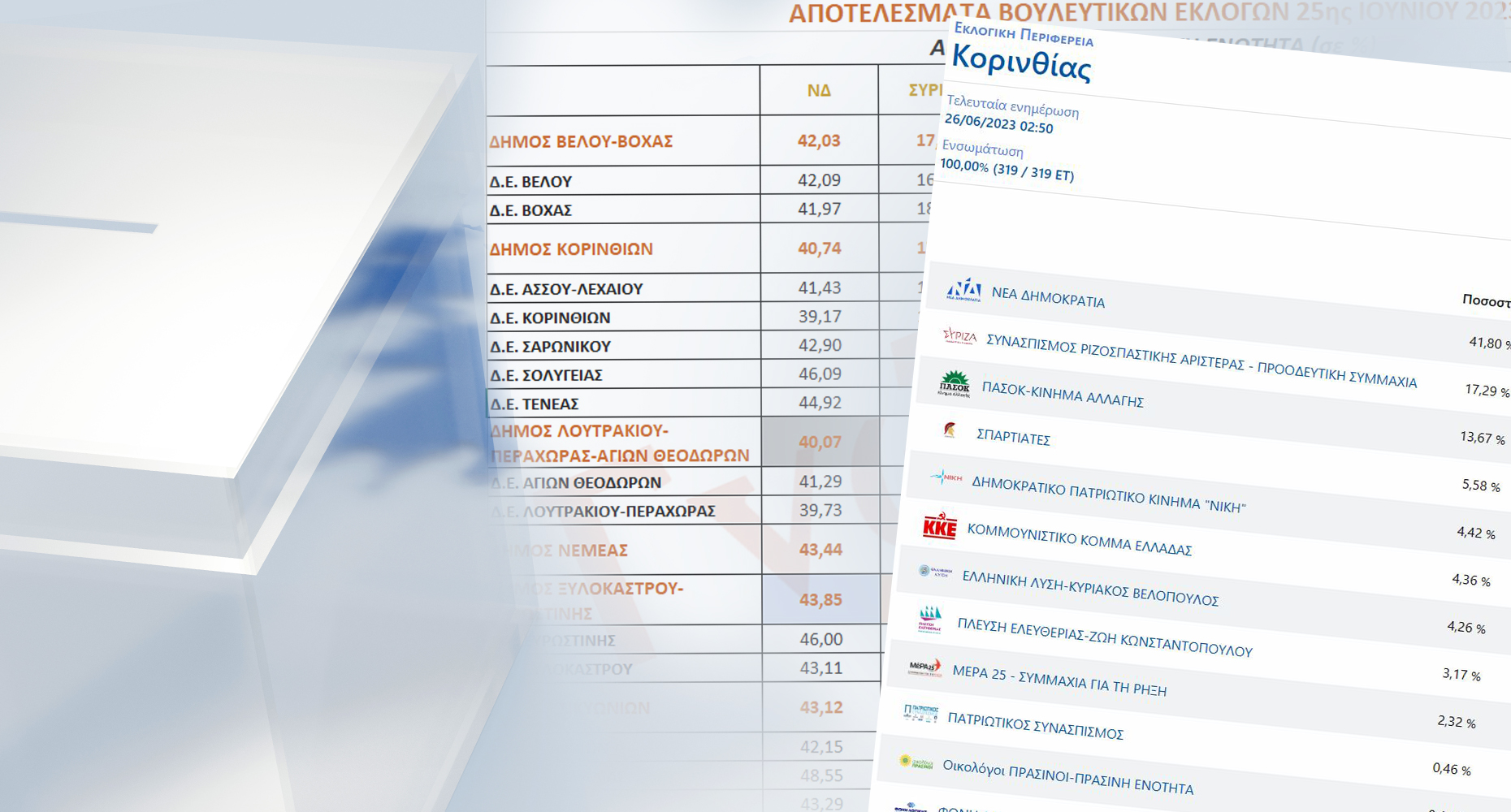 Με μικρή ποσοστιαία άνοδο της τάξης του 0,20% το κόμμα της Νέας Δημοκρατίας έκοψε και πάλι πρώτο το νήμα στις εκλογές της 25ης Ιουνίου στην Κορινθία και εξέλεξε τρεις βουλευτές. Εκλέγονται οι: Χρίστος Δήμας, Νίκος Ταγαράς και Μαριλένα Σούκουλη. Στον αντίποδα ο Γιώργος Ψυχογιός κατάφερε να κρατήσει την μοναδική έδρα του ΣΥΡΙΖΑ-Προοδευτική Συμμαχία στον νομό παρά τις σημαντικές απώλειες του 2,56% που κάποια στιγμή στην διάρκεια της καταμέτρησης έδειξαν ότι ήταν αρκετές για να χαθεί η αριστερή έδρα. Από την άλλη το ΠΑΣΟΚ-Κίνημα Αλλαγής έχασε κι αυτό κάποιες δυνάμεις στην Κορινθία οι οποίες αθροίζονται σε ποσοστό 0,47%. Φυσικά, έχασε και την έδρα καθώς η ενισχυμένη αναλογική που εφαρμόστηκε σε αυτή την εκλογική αναμέτρηση «έκοψε» την Κατερίνα Ταγαρά.