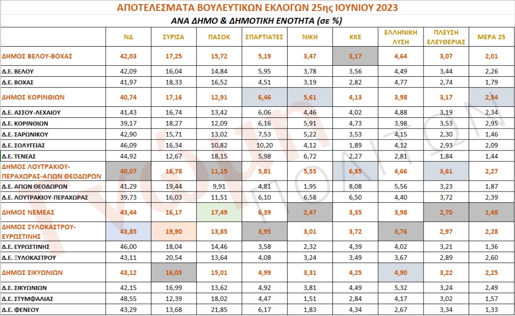 Σε επίπεδο δήμων, το μεγαλύτερο ποσοστό της η ΝΔ το κατέγραψε στον Δήμο Ξυλοκάστρου-Ευρωστίνης με 43,85% ενώ το χαμηλότερο στον δήμο Λουτρακίου-Περαχώρας-Αγίων Θεοδώρων με 40,07%. Αντίστοιχα ο ΣΥΡΙΖΑ πέτυχε την υψηλότερη επίδοσή του κι αυτός στον Δήμο Ξυλοκάστρου-Ευρωστίνης με 19,90% και την χαμηλότερη στον δήμο Σικυωνίων με 16,05%. Το ΠΑΣΟΚ είχε υψηλότερο ποσοστό στον δήμο Νεμέας (17,49%) και χαμηλότερο στον Δήμο Λουτρακίου-Περαχώρας Αγίων Θεοδώρων (11,15%), ενώ οι Σπαρτιάτες κινήθηκαν ψηλότερα στο δήμο Κορινθίων με 6,46% και χαμηλότερα στον Δήμο Ξυλοκάστρου Ευρωστίνης με 3,95%.