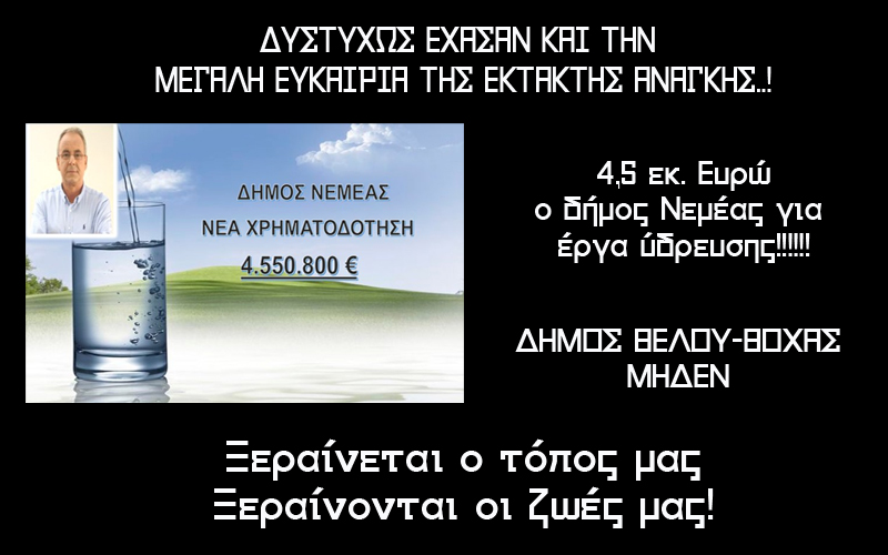 Δεν θα έπρεπε να γνωρίζετε ότι ο Δήμος βέλου βόχας(όπως και η νεμεα) έχει πάρει έργο αξίας 4.340.000€ για έργα ύδρευσης;;;