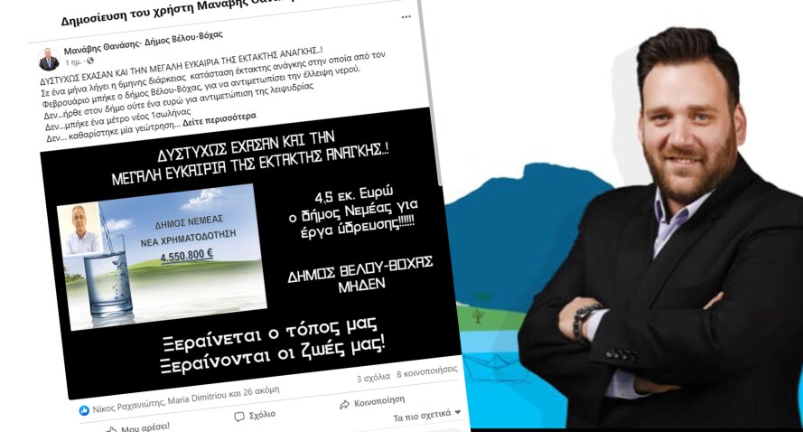 «Δυστυχώς έχασαν και τη μεγάλη ευκαιρία της έκτακτης ανάγκης!». Με αυτά τα λόγια ξεκινούσε η ανάρτηση στην σελίδα του υποψηφίου δημάρχου Βέλου-Βόχας Θανάση Μανάβη, η οποία συνέχιζε ως εξής: «Σε ένα μήνα λήγει η 6μηνης διάρκειας κατάσταση έκτακτης ανάγκης στην οποία από τον Φεβρουάριο μπήκε ο δήμος Βέλου-Βόχας, για να αντιμετωπίσει την έλλειψη νερού.