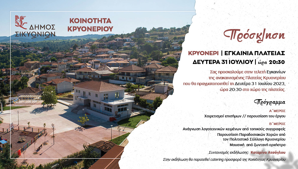 Σήμερα, Δευτέρα 31 Ιουλίου 2023, ώρα 20:30 θα πραγματοποιηθούν τα εγκαίνια της νέας πλατείας στο Κρυονέρι. Η αναβολή της εκδήλωσης την προηγούμενη εβδομάδα ήταν επιβεβλημένη, την ώρα που τα πύρινα μέτωπα σε διάφορες περιοχές της χώρας μας προκάλεσαν πόνο και καταστροφές.
