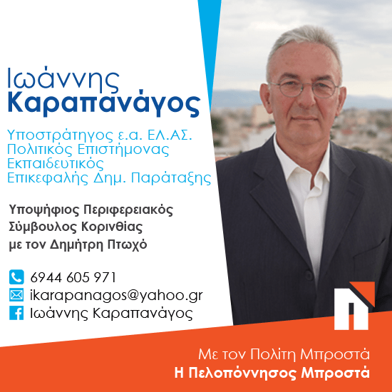 Σε αυτή την εκλογική αναμέτρηση, ο κ. Καραπανάγος κοσμεί με την παρουσία του το ψηφοδέλτιο του Δημήτρη Πτωχού στην Περιφέρεια και διεκδικεί την εκλογή του ως Περιφερειακός Σύμβουλος της Κορινθίας.
