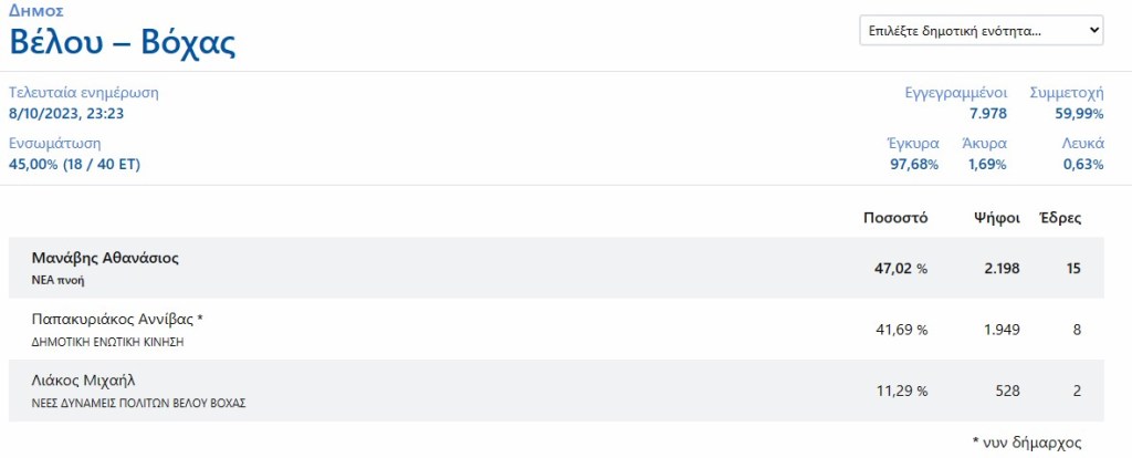 Με την ενσωμάτωση στο 45% ο κ. Μανάβης συγκεντρώνει το 47,02% και εκλέγεται Δήμαρχος Βέλου-Βόχας