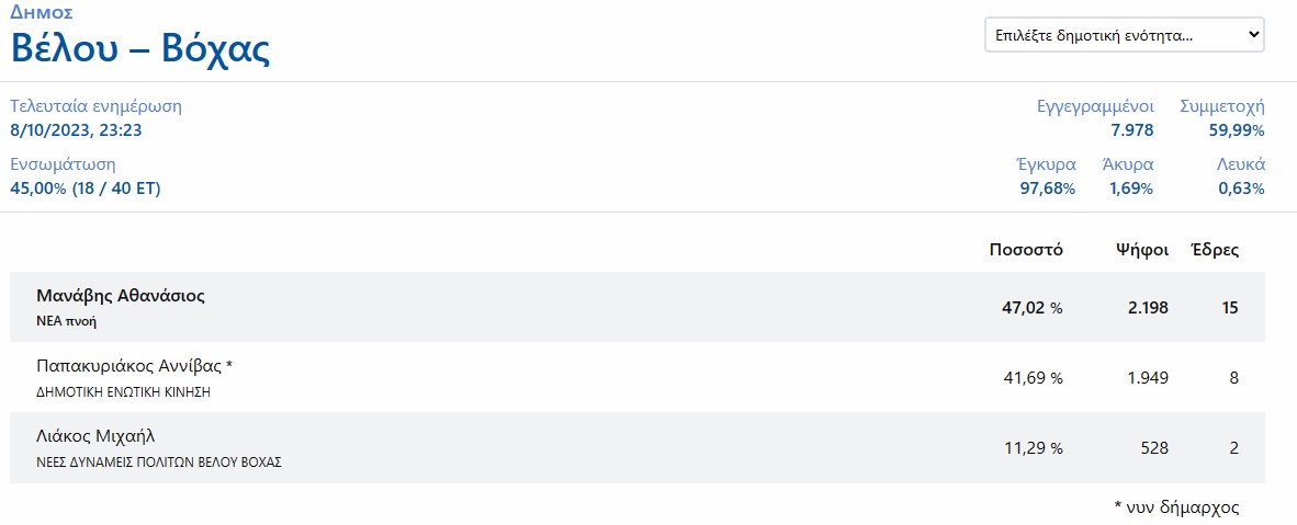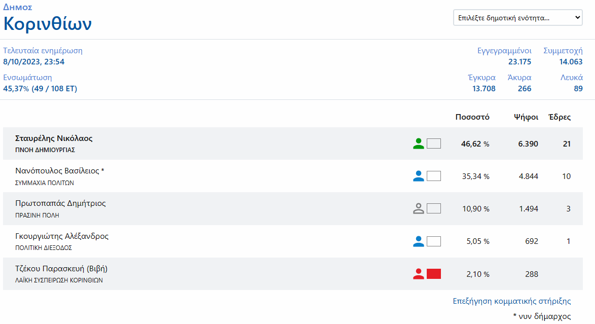 Με την ενσωμάτωση στο 45,37% ο κ. Σταυρέλης συγκεντρώνει το 46,62% και εκλέγεται Δήμαρχος Κορινθίων
