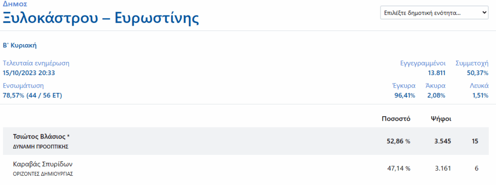 Με ενσωματωμένο το 78,57% των εκλογικών τμημάτων ο Βλάσης Τσιώτος καταλαμβάνει ποσοστό 52,86% και ο Σπύρος Καραβάς το 47,14%. Όπως φαίνεται το αποτέλεσμα αυτό δεν ανατρέπεται και συνεπώς ο κ. Τσιώτος επανεκλέγεται δήμαρχος Ξυλοκάστρου-Ευρωστίνης.