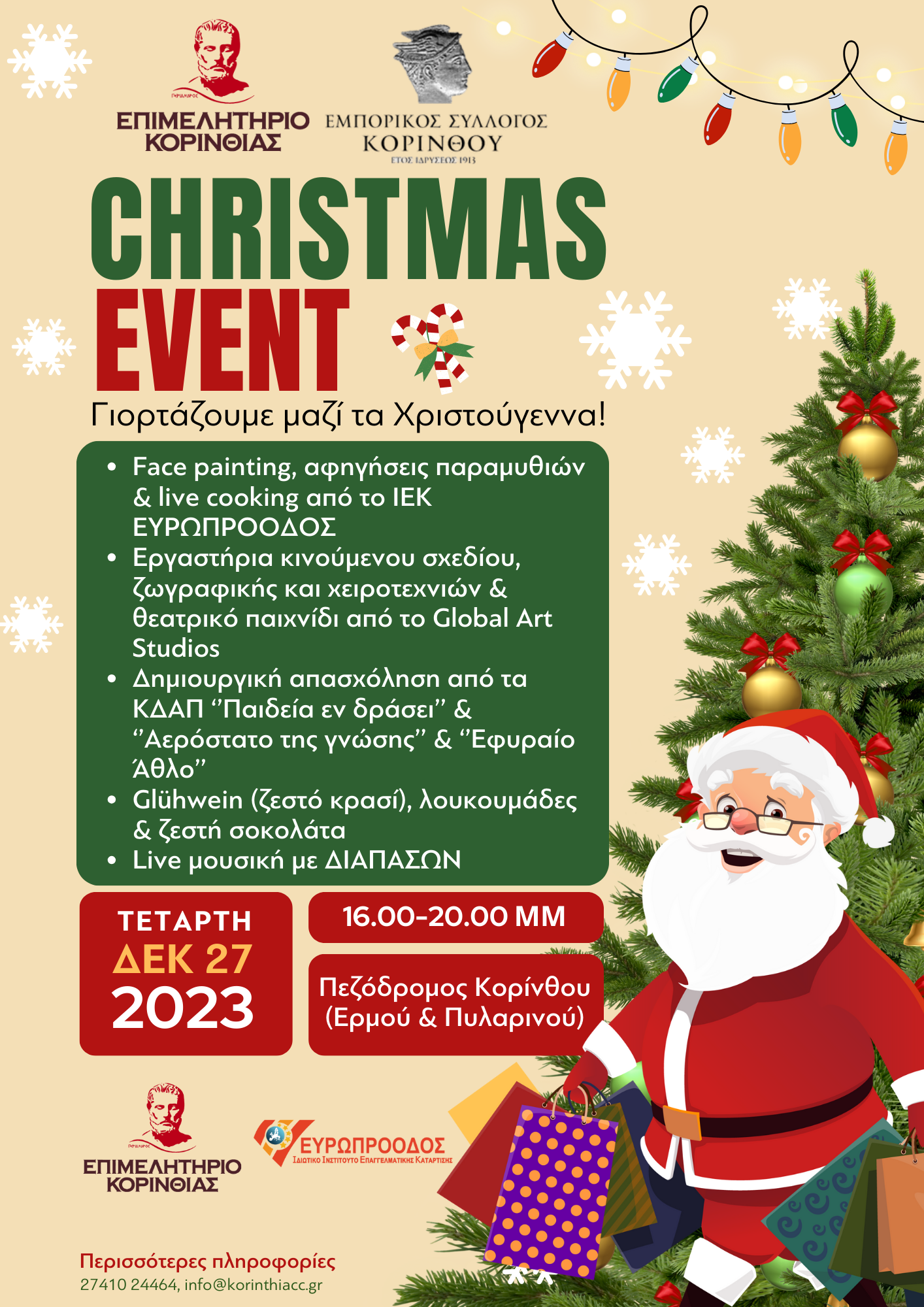 Ένα μεγάλο Χριστουγεννιάτικο πάρτυ με μουσική και δράσεις για τα παιδιά θα στηθεί την Τετάρτη 27 Δεκεμβρίου 2023 στον πεζόδρομο Κορίνθου (στο ύψος της Ερμού με την Πυλαρινού) από το Επιμελητήριο Κορινθίας και τον Εμπορικό Σύλλογο Κορίνθου.