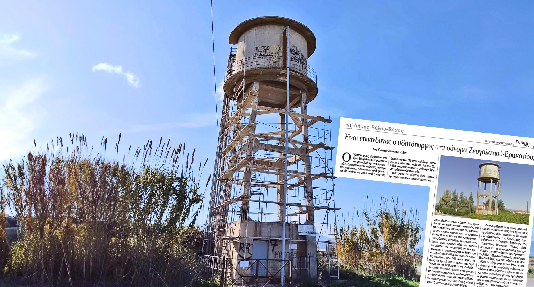 Από την άνοιξη του 2020 η εφημερίδα μας έκρουε τον κώδωνα του κινδύνου για την στατική κατάσταση του Υδατόπυργου που βρίσκεται στα σύνορα Βραχατίου-Ζευγολατιού. Στο φύλλο 192, στις 3 Μαρτίου 2020, γράφαμε: «Είναι επικίνδυνος ο υδατόπυργος στα σύνορα Ζευγολατιού-Βραχατίου;» και στο άρθρο διεξοδικά αναλύαμε όλα εκείνα τα στοιχεία, που κατά τη γνώμη μας καθιστούσαν αναγκαία την συντήρηση, υποστύλωση και στήριξη του εν λόγω κτίσματος.
