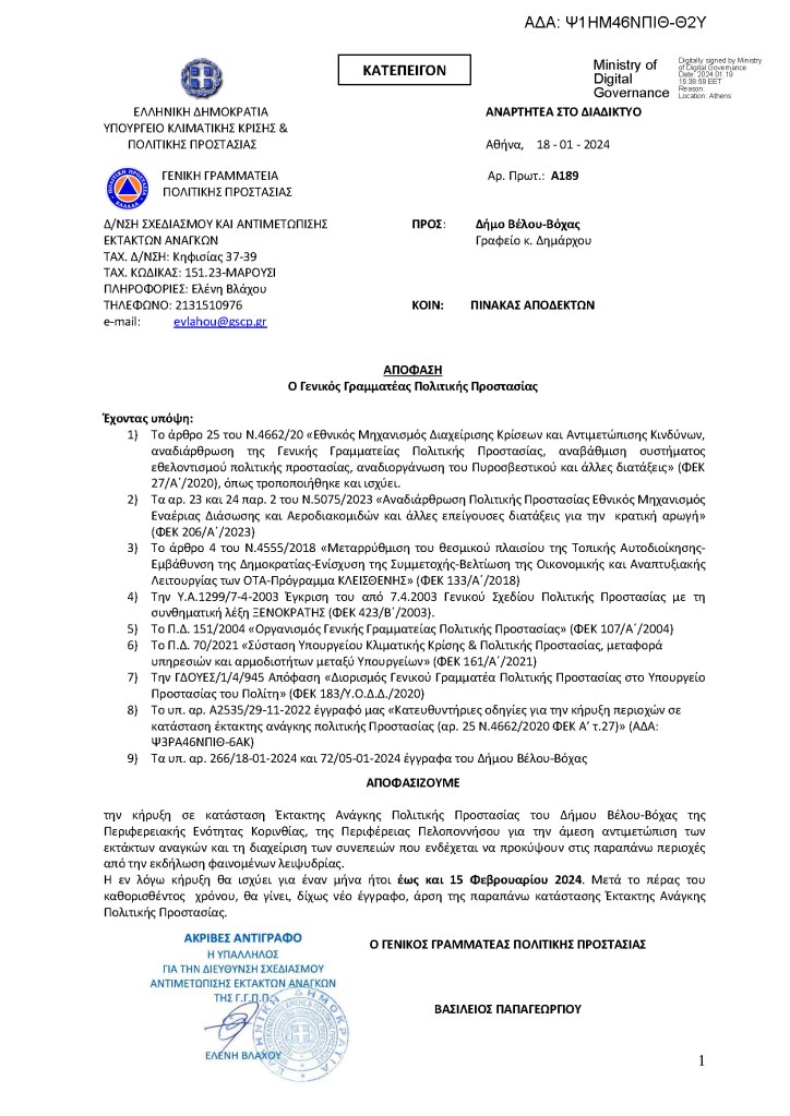 Τελικά την Πέμπτη 18 Ιανουαρίου όπως προκύπτει από το σχετικό έγγραφο της Γενικής Γραμματείας Πολιτικής Προστασίας ο δήμος κηρύχθηκε σε κατάσταση έκτακτης ανάγκης, αλλά μόνον για έναν μήνα, 27 μέρες για την ακρίβεια, αφού η κατάσταση έκτακτης ανάγκης λήγει στις 15 Φεβρουαρίου 2024. «Μετά το πέρας του καθορισθέντος χρόνου, θα γίνει, δίχως νέο έγγραφο, άρση της παραπάνω κατάστασης Έκτακτης Ανάγκης Πολιτικής Προστασίας», τονίζεται στην απόφαση.