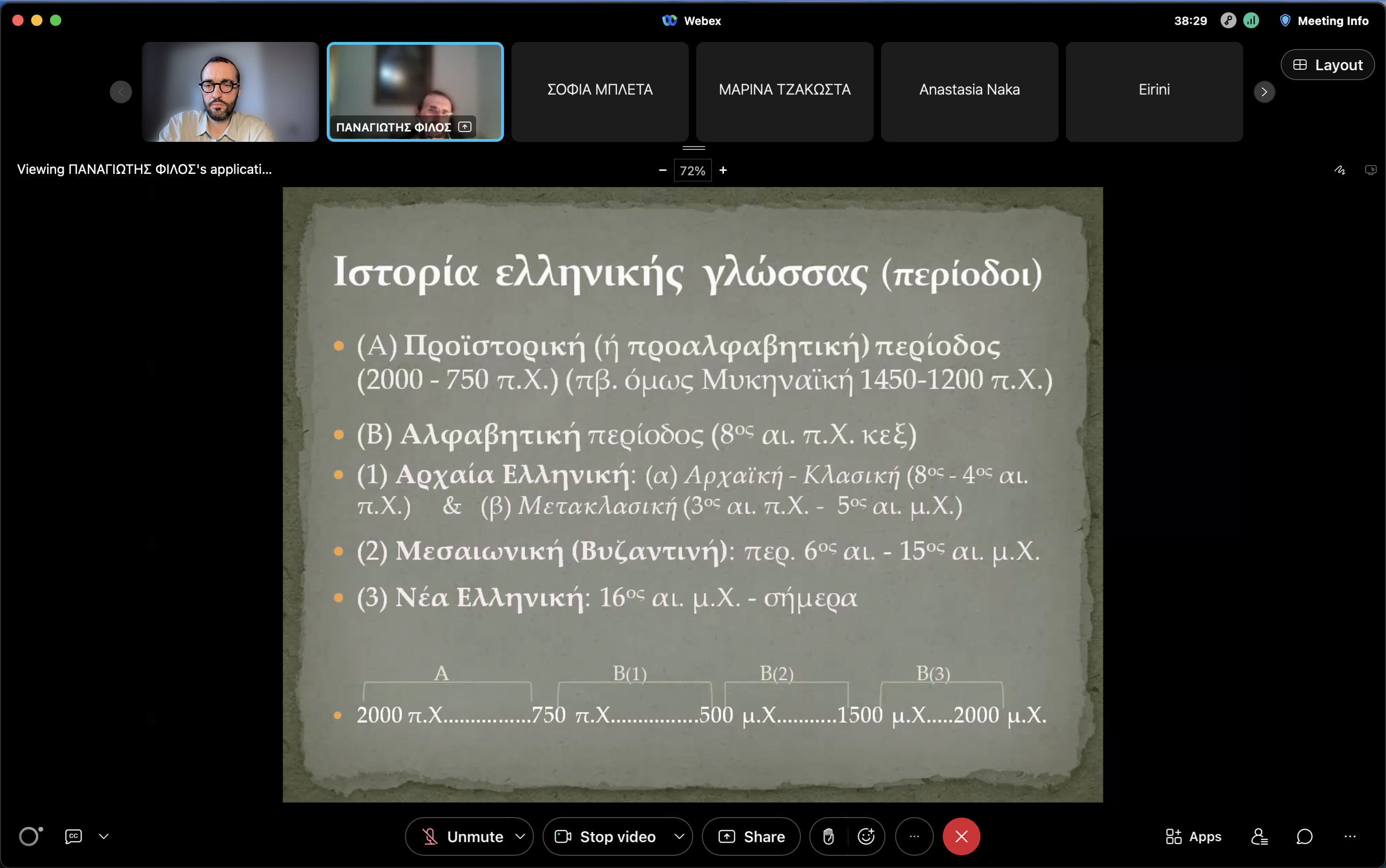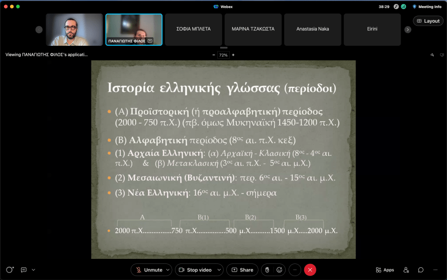 Σε μία μεστή διάλεξη που κράτησε αμείωτο το ενδιαφέρον των συμμετεχόντων, ο Αναπληρωτής Καθηγητής Παναγιώτης Φίλος αναφέρθηκε σε βασικούς σταθμούς της ιστορικής εξέλιξης της ελληνικής και στην διαχρονική μεταβολή των ελληνόφωνων κοινοτήτων διεθνώς.