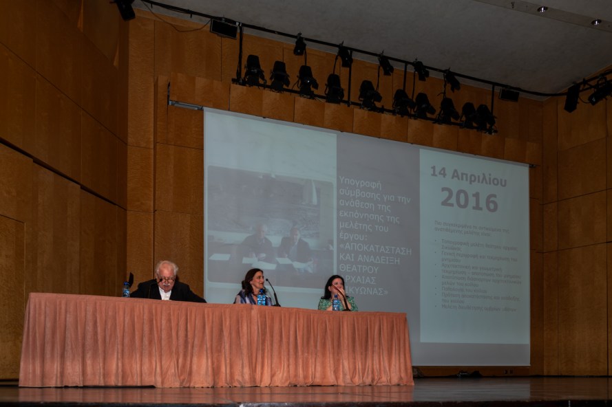 Κατόπιν οι ομιλίες από την αρχαιολόγο Δήμητρα Ανδρίκου και την Προϊσταμένη της Εφορείας Αρχαιοτήτων Κορινθίας Γιώτα Κασίμη, στην οποία ο δήμαρχος Σικυωνίων δεν παρέλειψε να εκφράσει τις πολλές και θερμές ευχαριστίες του, καθώς και σε όλους τους αρχαιολόγους που έχουν δουλέψει στο αρχαίο θέατρο, για την επιμονή και την πίστη τους στο έργο της αποκάλυψης, αλλά και την άψογη πολυετή συνεργασία στο κοινό όραμα της απόδοσης στην οικουμένη του θέατρου Αρχαίας Σικυώνας.