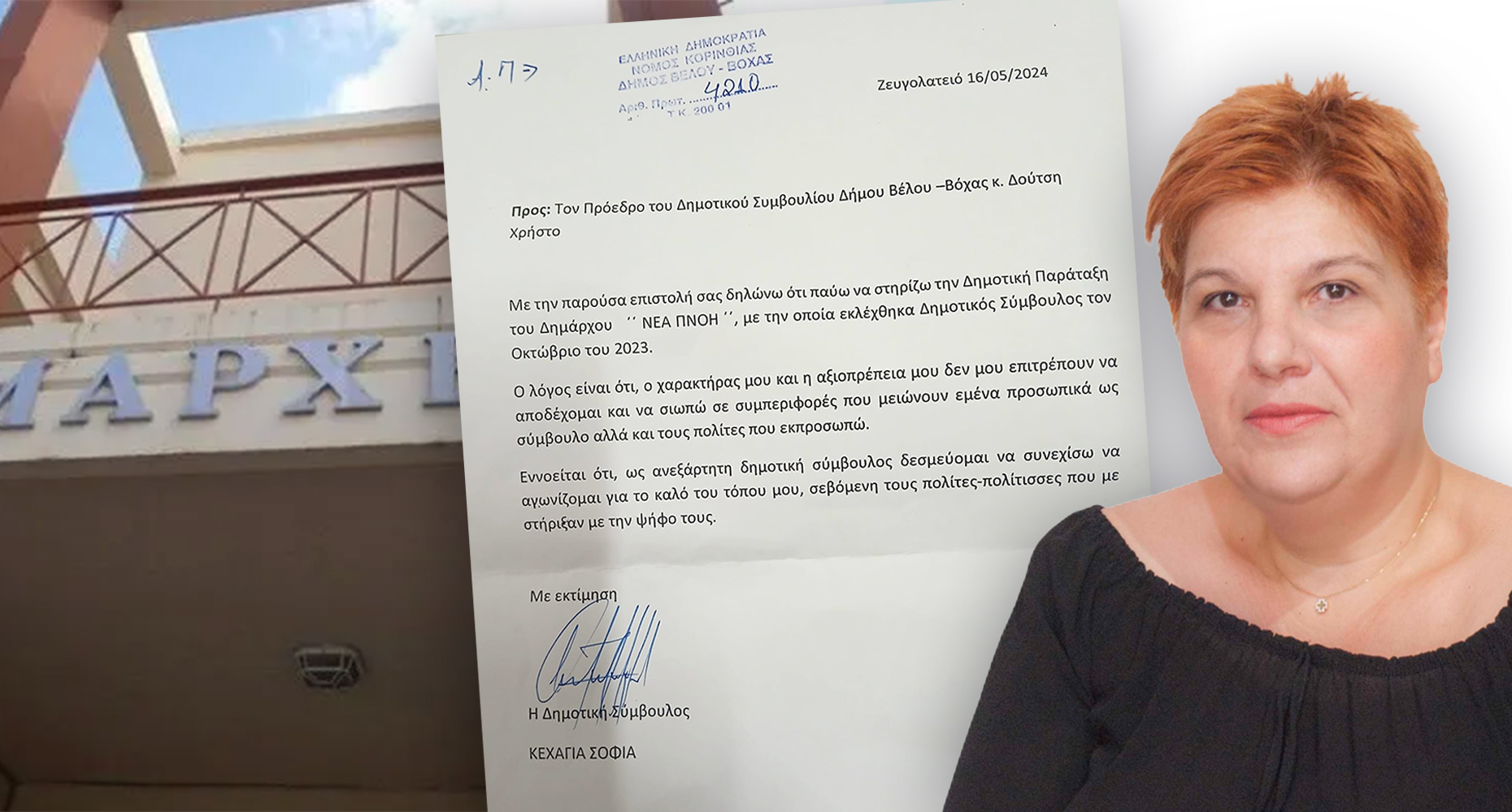Την ανεξαρτητοποίησή της από την παράταξη «Νέα Πνοή» του δημάρχου Θανάση Μανάβη, δήλωσε η δημοτική σύμβουλος Σοφία Κεχαγιά με επιστολή της προς τον πρόεδρο του Δημοτικού Συμβουλίου Βέλου-Βόχας, την Πέμπτη 16 Μαΐου 2024.
