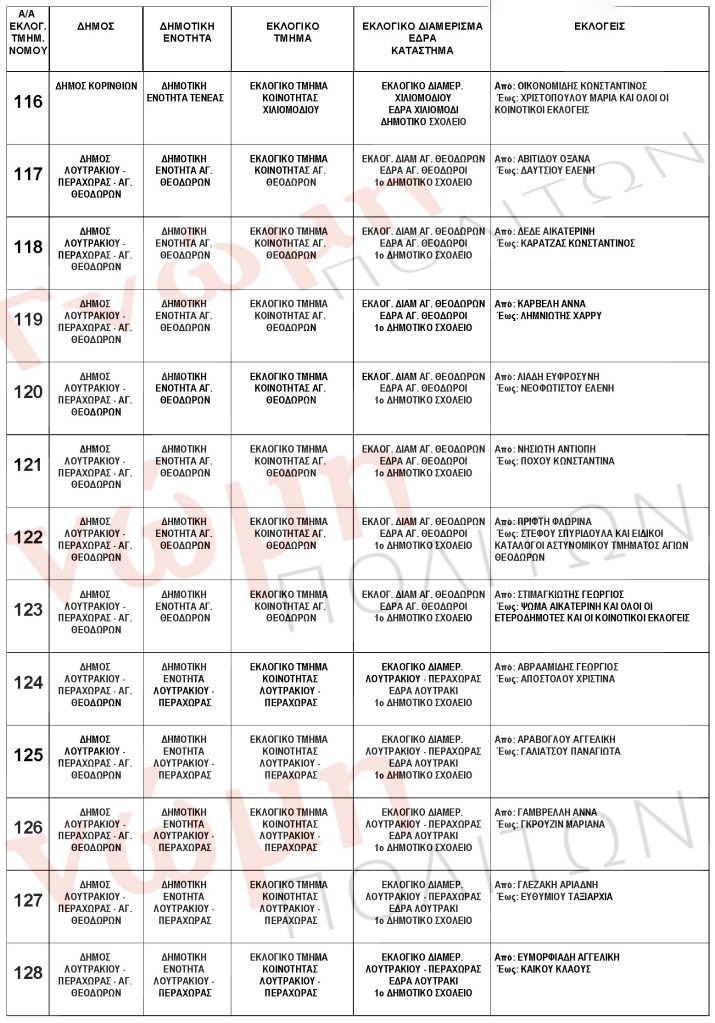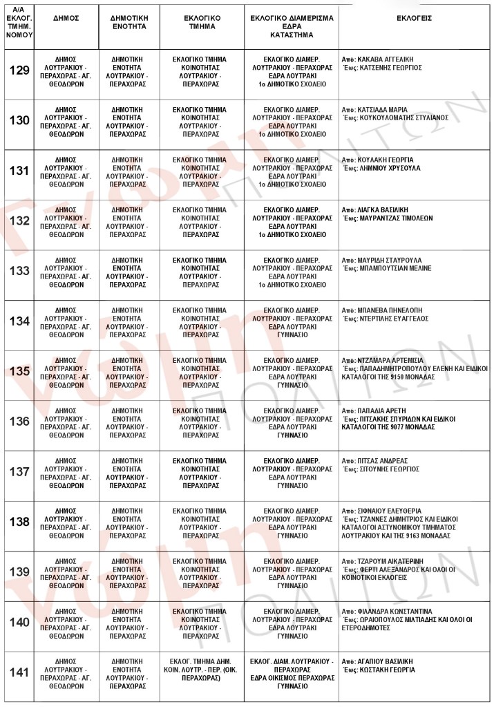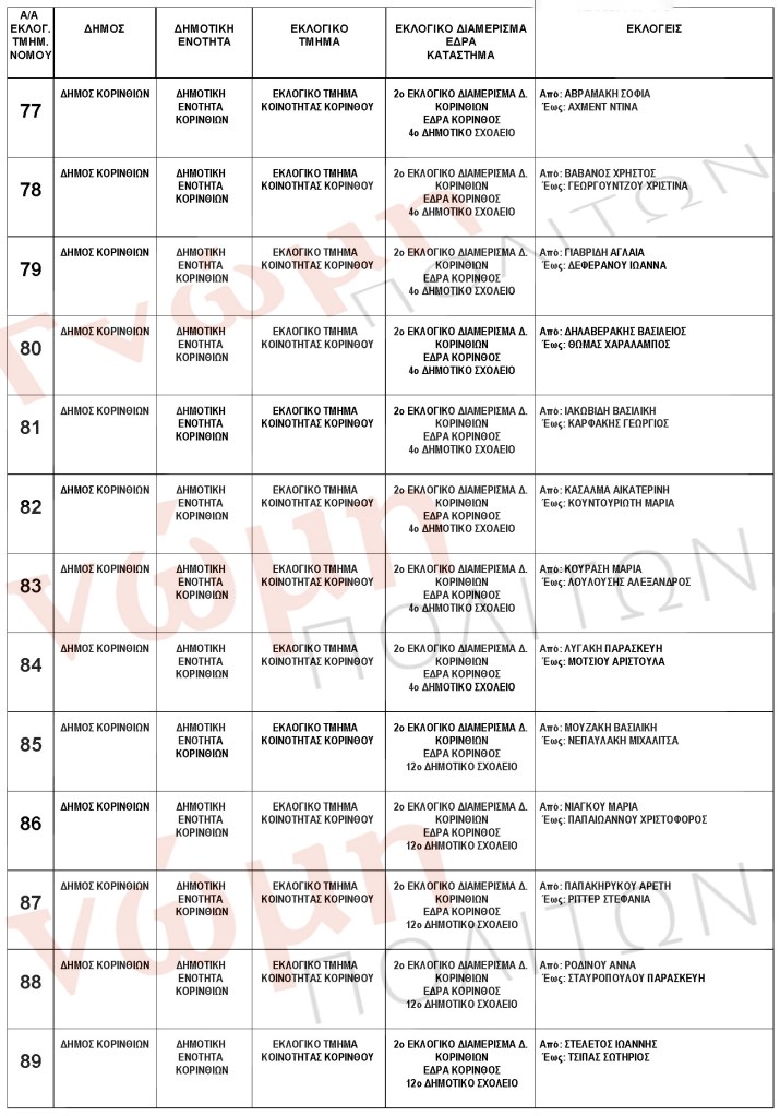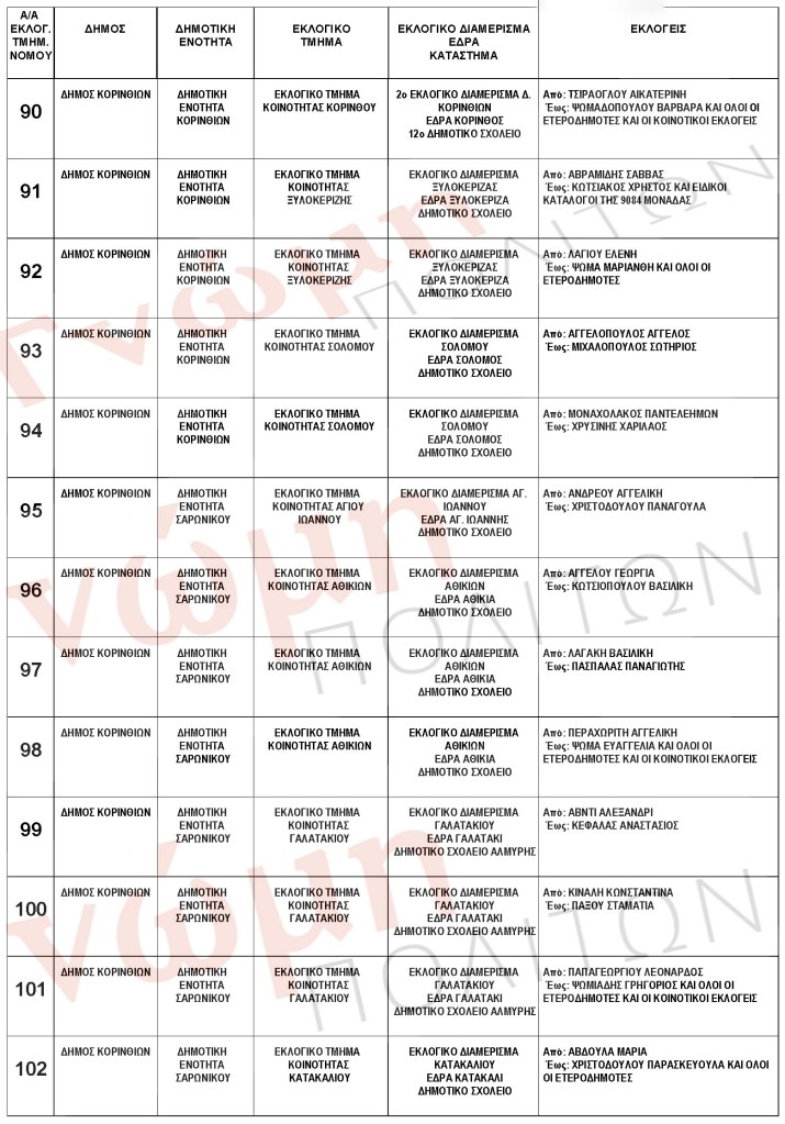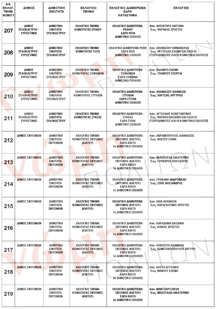 Σημείωση: Στους πίνακες, στην τελευταία στήλη, διαβάζετε το πρώτο και το τελευταίο όνομα των εγγεγραμμένων εκλογεών στο αντίστοιχο τμήμα, ώστε να μπορείτε να προσδιορίσετε σε ποιο τμήμα ανήκετε.