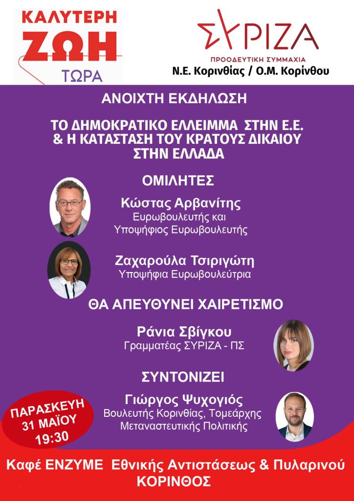 Η Νομαρχιακή Επιτροπή Κορινθίας και η Οργάνωση μελών Κορίνθου διοργανώνουν ανοιχτή πολιτική εκδήλωση του ΣΥΡΙΖΑ-ΠΣ για «Το δημοκρατικό έλλειμμα στην Ε.Ε. & την κατάσταση του Κράτους Δικαίου στην Ελλάδα», την Παρασκευή 31/5, στις 7:30 μμ στο καφέ Enzyme στην Κόρινθο (Εθνικής Αντιστάσεως & Πυλαρινού).