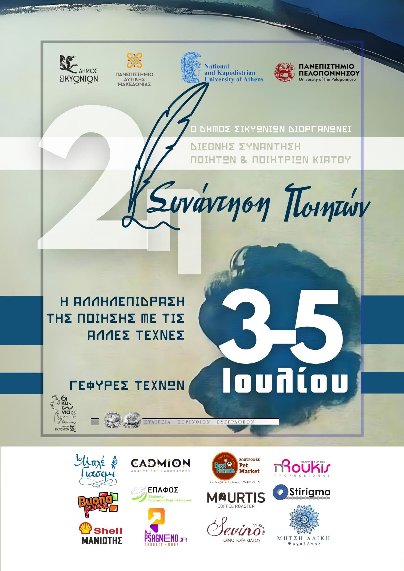 Την Τετάρτη 3 Ιουλίου 2024 στη Δημοτική Βιβλιοθήκη Σικυωνίων θα πραγματοποιηθεί η εναρκτήρια εκδήλωση – 30 ποιητές και ποιήτριες από την Ελλάδα και εξωτερικό θα συναντηθούν και θα συνομιλήσουν για την ποίηση και την αλληλεπίδρασή της με τις άλλες τέχνες