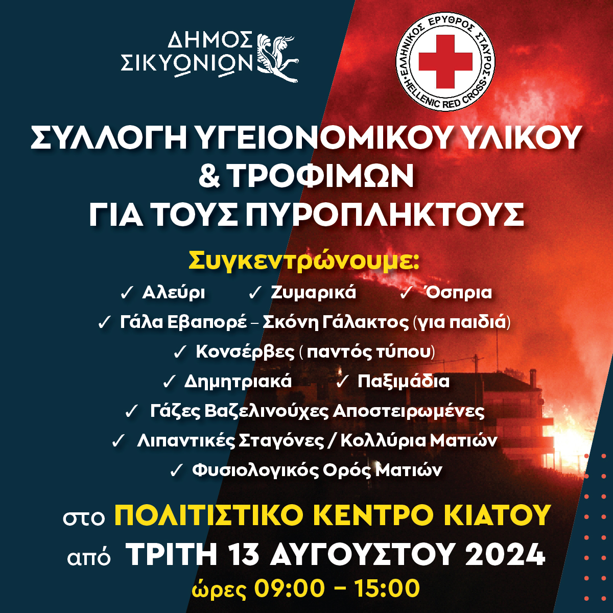 Γι’ αυτό ο Δήμος Σικυωνίων σε συνεργασία με τον Ελληνικό Ερυθρό Σταυρό οργανώνει από την ΤΡΙΤΗ 13 ΑΥΓΟΥΣΤΟΥ 2024 συλλογή Υγειονομικού Υλικού και Τροφίμων για τους πυρόπληκτους συνανθρώπους μας.