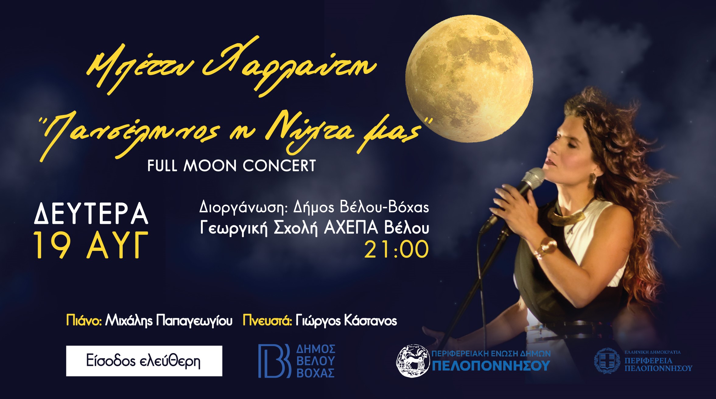 «Πανσέληνος η νύχτα μας…» είναι ο τίτλος της συναυλίας που θα παρουσιάσει η Μπέττυ Χαρλαύτη, τη Δευτέρα 19 Αυγούστου προσκεκλημένη του δήμου Βέλου – Βόχας, στις 9:00 μ.μ. στον χώρο της Γεωργικής Σχολής ΑΧΕΠΑ Βέλου.