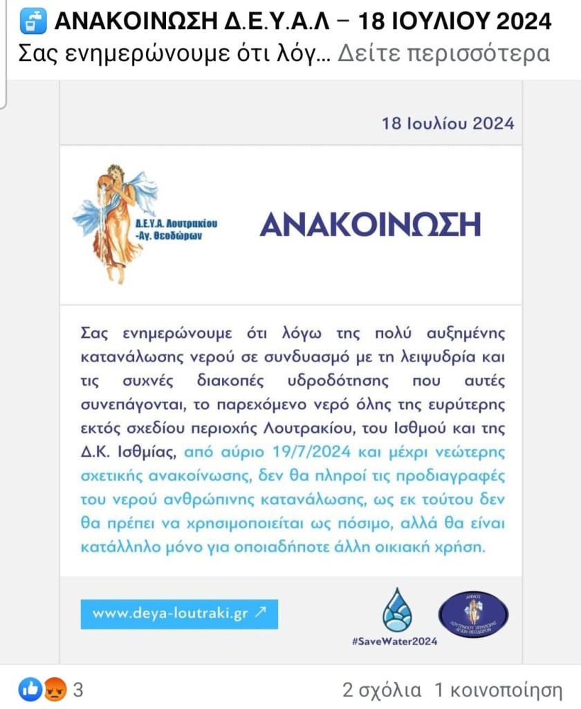 Από την άλλη, ο Δήμος Κορινθίων ανακοινώνει στους δημότες του ότι η μία μετά την άλλη οι κοινότητές του υδρεύονται πλέον και με νερό γεωτρήσεων ακατάλληλο προς πόση.