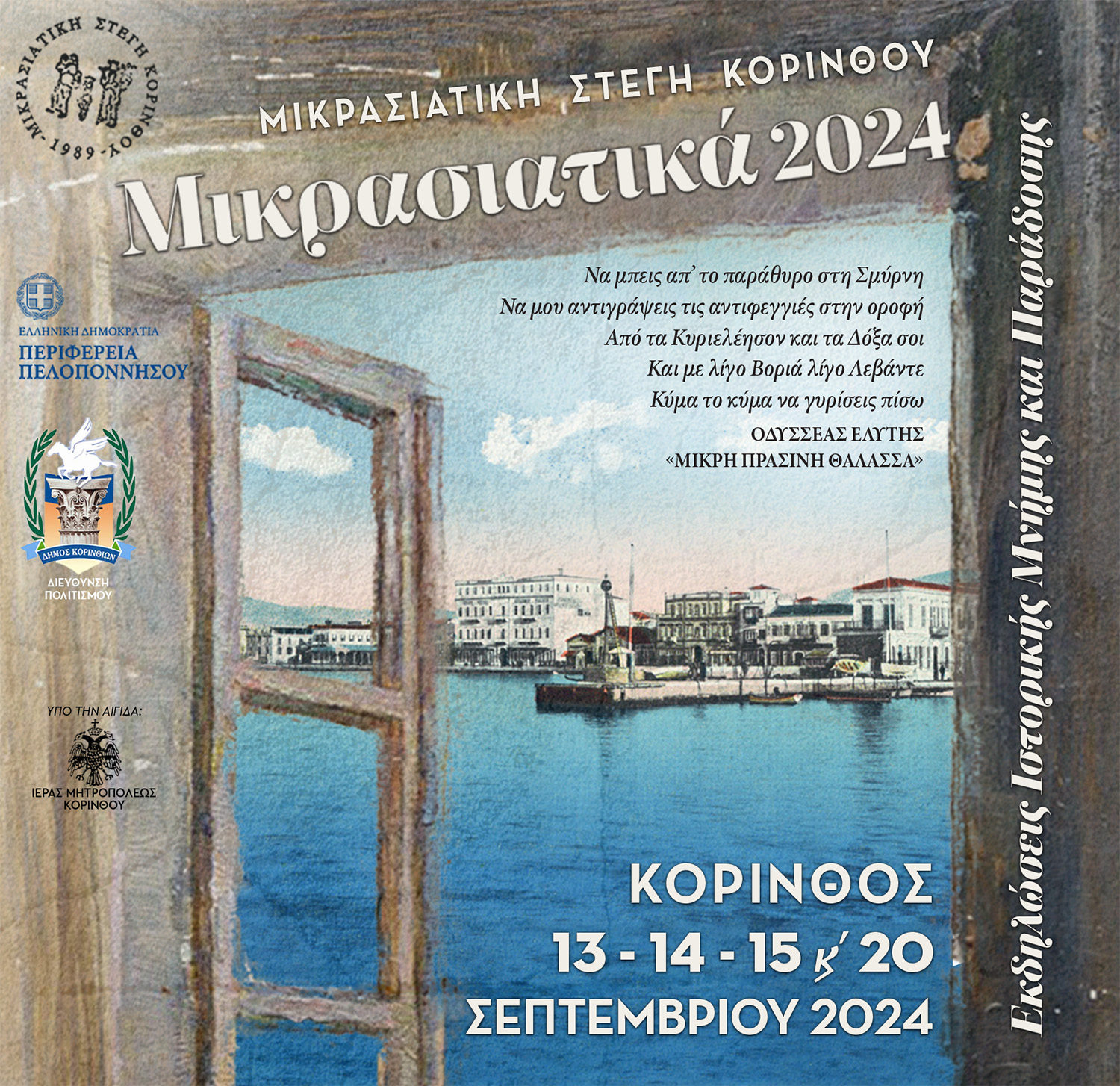 Για άλλη μία χρονιά η Μικρασιατική Στέγη Κορίνθου διοργανώνει τις καθιερωμένες εκδηλώσεις Μνήμης για την Μικρασιατική Καταστροφή και τον ξεριζωμό του 1922. Ο Σύλλογος που τιμά με την παρουσία του όχι μόνο την Κόρινθο, αλλά και όλη την Κορινθία, πιστός στο ραντεβού του με τη Μνήμη και την Ιστορία οργανώνει τα «Μικρασιατικά 2024» από την Παρασκευή 13 έως και την Κυριακή 20 Σεπτεμβρίου 2024.