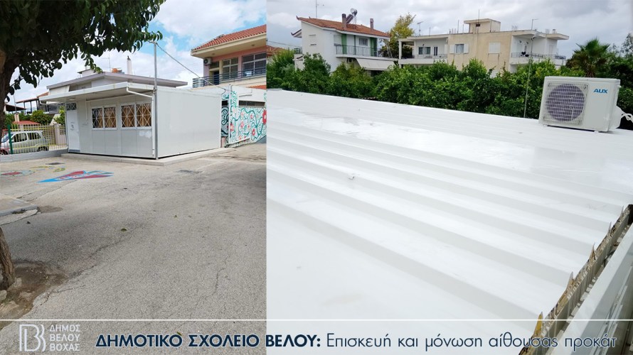 - Επισκευή της προκάτ αίθουσας, συντήρηση και μόνωση της οροφής της στο Δημοτικό Σχολείο Βέλου