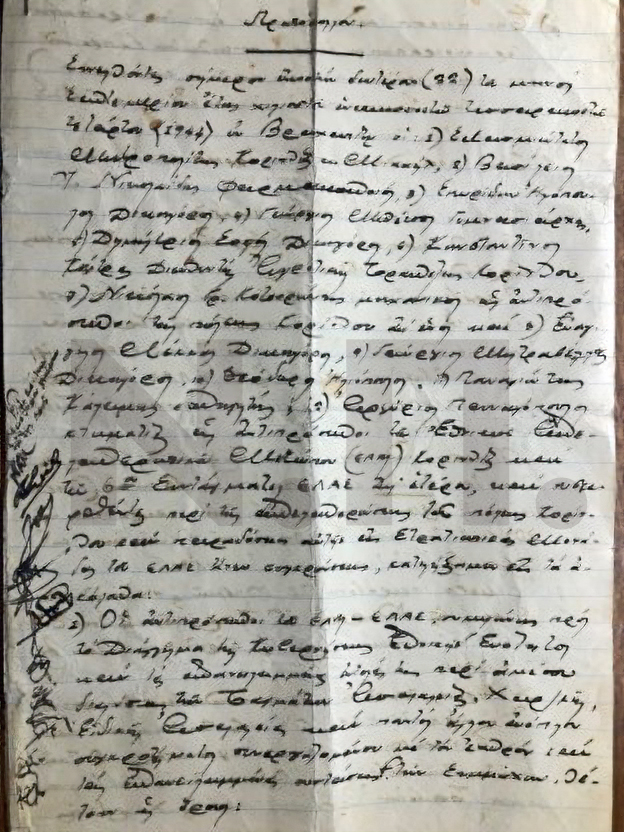 Εικόνα 1: Η πρώτη σελίδα του τρισέλιδου χειρόγραφου κειμένου με αναφορές στην ημερομηνία, τον τόπο συγκέντρωσης, καθώς και τους παριστάμενους και υπογράφοντες των δύο εμπλεκόμενων πλευρών, των αρχών και φορέων της πόλης της Κορίνθου, καθώς και των εκπροσώπων του ΕΑΜ και του 6ου Συντάγματος του ΕΛΑΣ.
