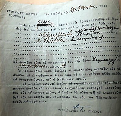 Εικόνα 3 : Από το παραπάνω έγγραφο φαίνεται καθαρά η κατοχική διάσταση της εποχής στην Κορινθία καθώς η διοικούσα αρχή χρησιμοποιούσε για την επίσημη αλληλογραφία της τον όρο «Γερμανική Επαρχία Κορινθίας».