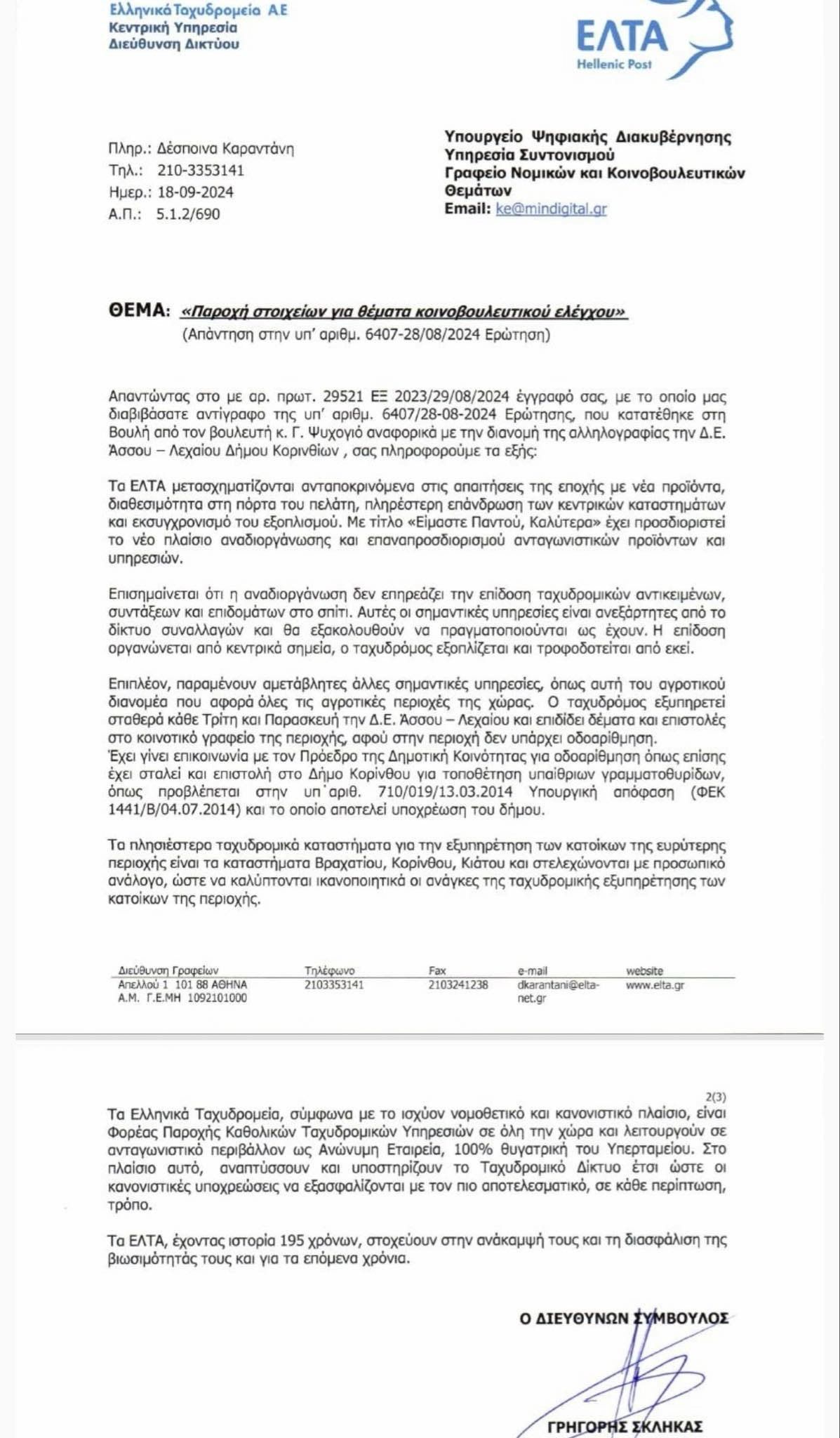Προτείνω ο αρμόδιος Υπουργός και η διοίκηση των ΕΛΤΑ να έρθουν στο Τ.Σ. Άσσου και στο Δημοτικό Συμβούλιο Κορινθίων να παρουσιάσουν αυτή την απάντηση…