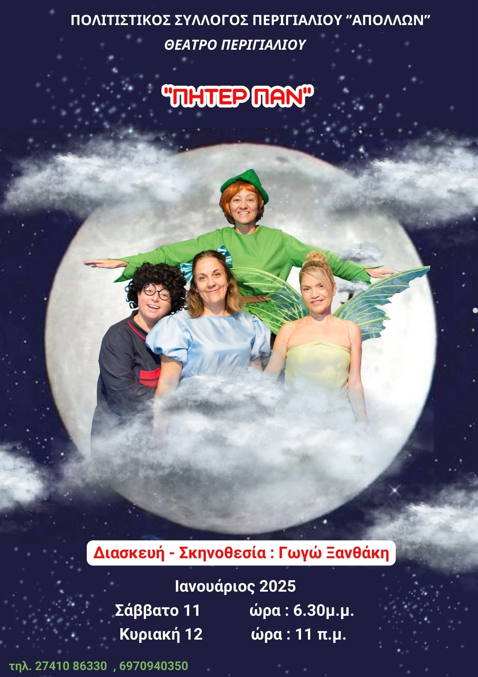 Η θεατρική μας ομάδα, ταξιδεύει στους αιθέρες επιλέγοντας την ιστορία του Πήτερ Παν, του παιδιού που ποτέ δεν μεγαλώνει και μας προσκαλεί να πετάξουμε μαζί του στο δεύτερο άστρο δεξιά και ευθεία μέχρι το πρωί! H ιστορία μας ξεκινάει μια Χριστουγεννιάτικη νύχτα γεμάτη αστέρια όταν ο Πήτερ Παν προσγειώνεται στην κρεβατοκάμαρα των παιδιών της οικογένειας Ντάρλινγκ, για να τους μάθει να πετάνε και να τους ταξιδέψει στην Ονειροχώρα. Εκεί θα συναντήσουν την Τίνκερμπελ, την Τίγρη Λίλυ, τα Χαμένα Παιδιά, αλλά και τον Κάπτεν Χουκ με τους πειρατές του. Η μια περιπέτεια διαδέχεται την άλλη, μέχρι να καταφέρουν τα παιδιά να βρουν ξανά το δρόμο για το σπίτι. Σ’ αυτό το μαγικό μας ταξίδι, θα γνωρίσουμε από κοντά την Ονειροχώρα, θα ανέβουμε στο καράβι του Κάπτεν Χουκ για να δούμε τα αξιοθέατα του νησιού του Πήτερ Παν ! Μια πολύ όμορφη δια δραστική παράσταση με τραγούδια, χορό, μουσική, που θα συναρπάσει τα παιδιά ηλικίας από 3 έως 11 ετών.