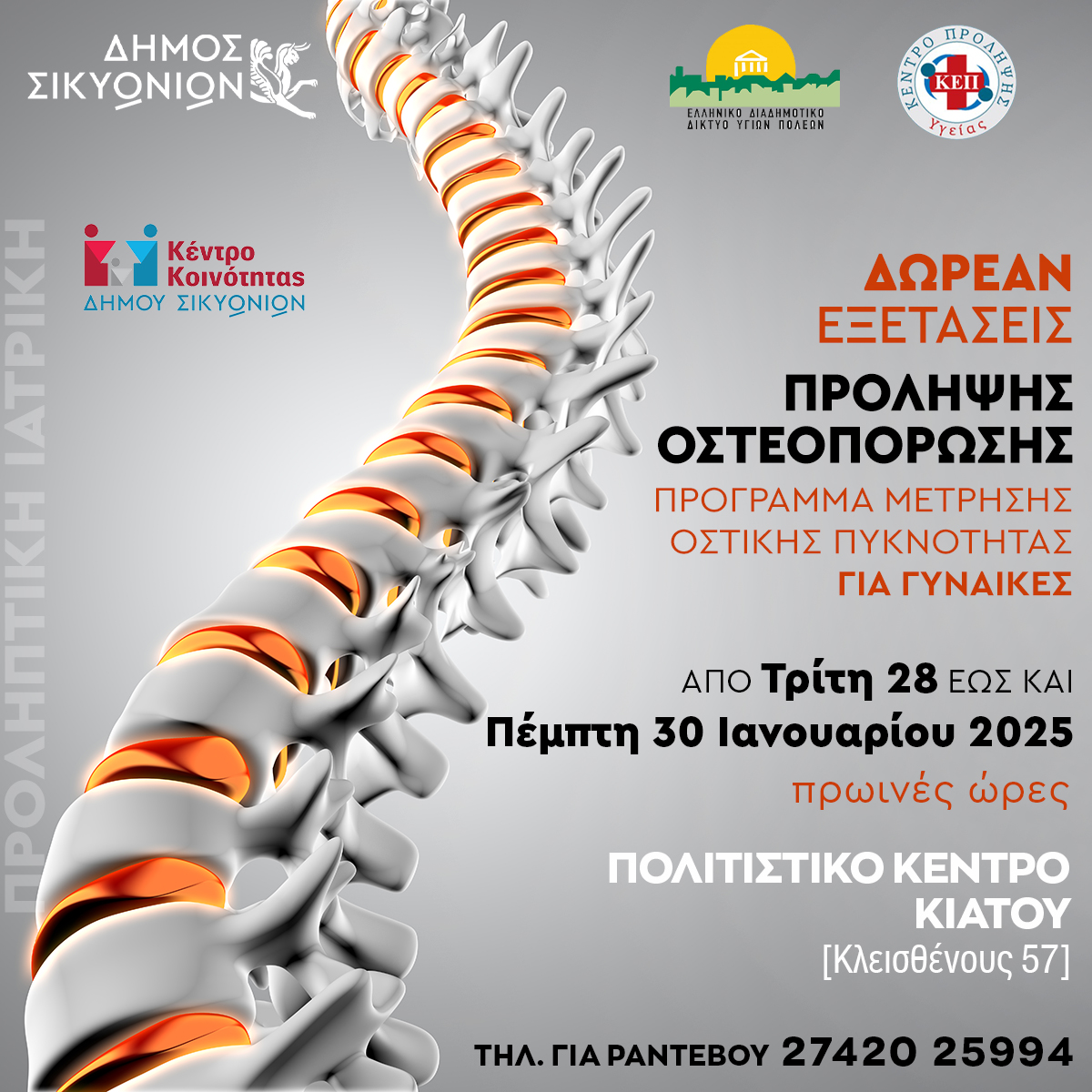 Ο Δήμος Σικυωνίων, σε συνεργασία με το Ελληνικό Διαδημοτικό Δίκτυο Υγιών Πόλεων (ΕΔΔΥΠΠΥ), το ΚΕΠ Υγείας και το Κέντρο Κοινότητας του Δήμου, διοργανώνει Πρόγραμμα Μέτρησης Οστικής Πυκνότητας για γυναίκες, με στόχο την πρόληψη της οστεοπόρωσης.