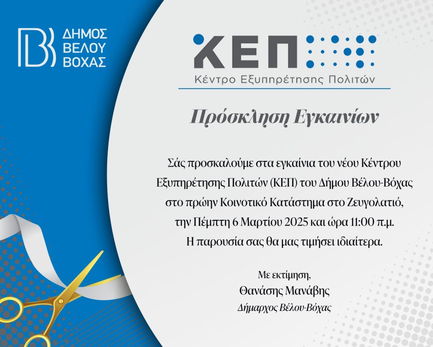Ο δήμαρχος Βέλου-Βόχας, Θανάσης Μανάβης, προσκαλεί τους δημότες να παραστούν στην εκδήλωση, τονίζοντας τη σημασία του νέου ΚΕΠ ως βασικού εργαλείου για την άμεση και ποιοτική εξυπηρέτηση των πολιτών.