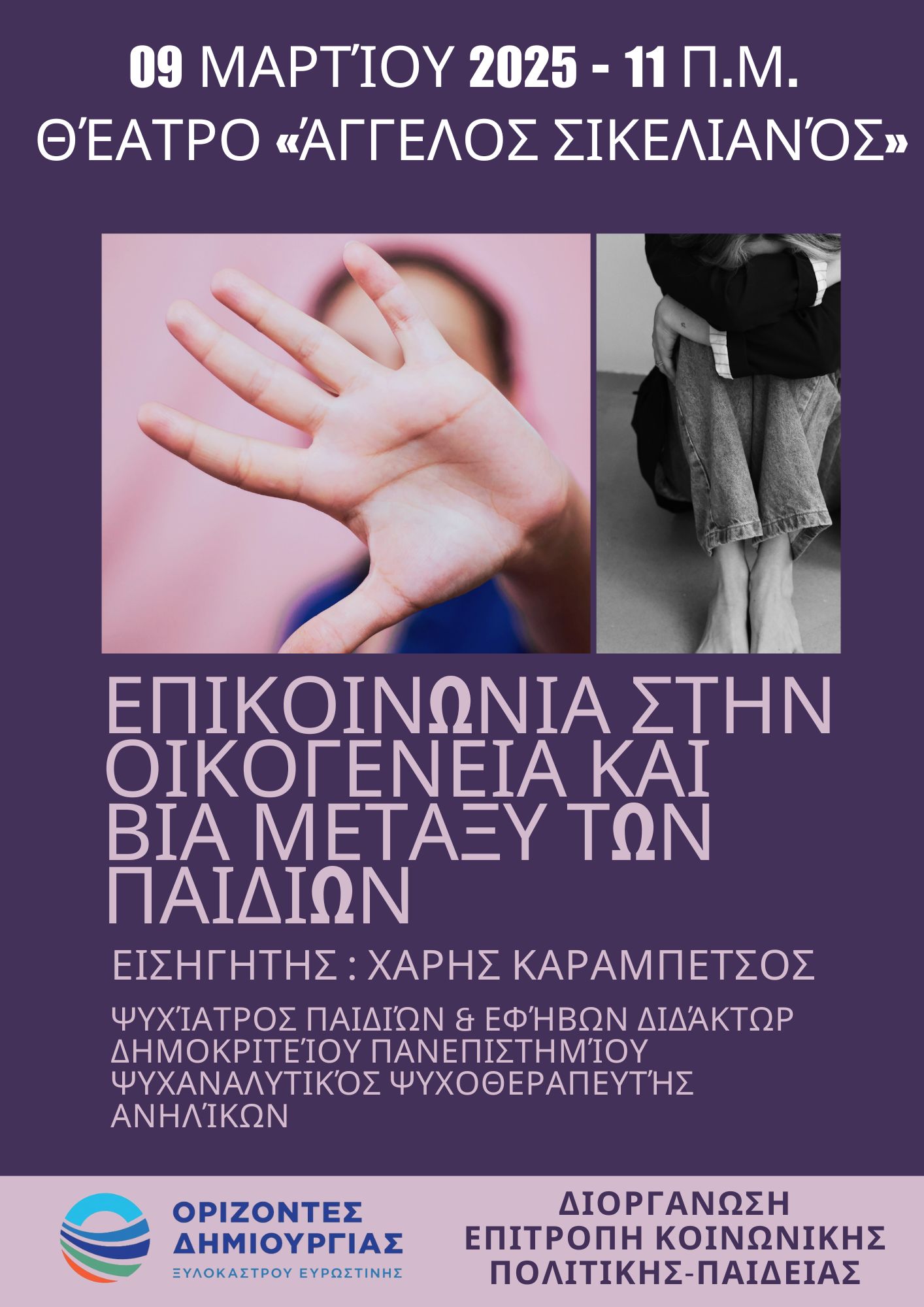 Σε μια εποχή που η βία στα σχολεία αποτελεί ένα διαρκώς εντεινόμενο κοινωνικό φαινόμενο, οι «Ορίζοντες Δημιουργίας», η δημοτική παράταξη του Σπύρου Καραβά, της μείζονος, δηλαδή, αντιπολίτευσης στον Δήμο Ξυλοκάστρου-Ευρωστίνης, αναλαμβάνει πρωτοβουλία: Διοργανώνει μια εξαιρετικά σημαντική ενημερωτική ομιλία με θέμα την επικοινωνία στην οικογένεια και τη βία μεταξύ των παιδιών.
