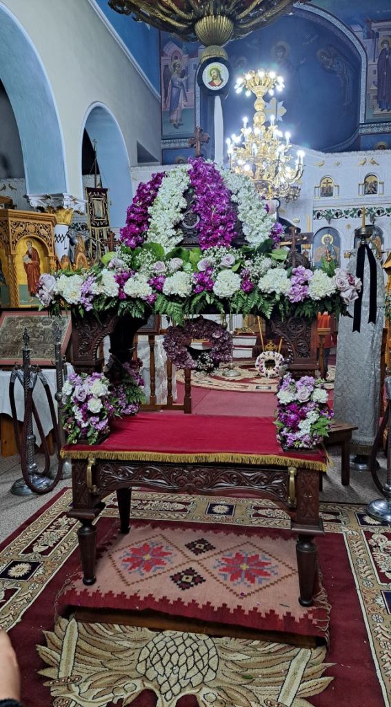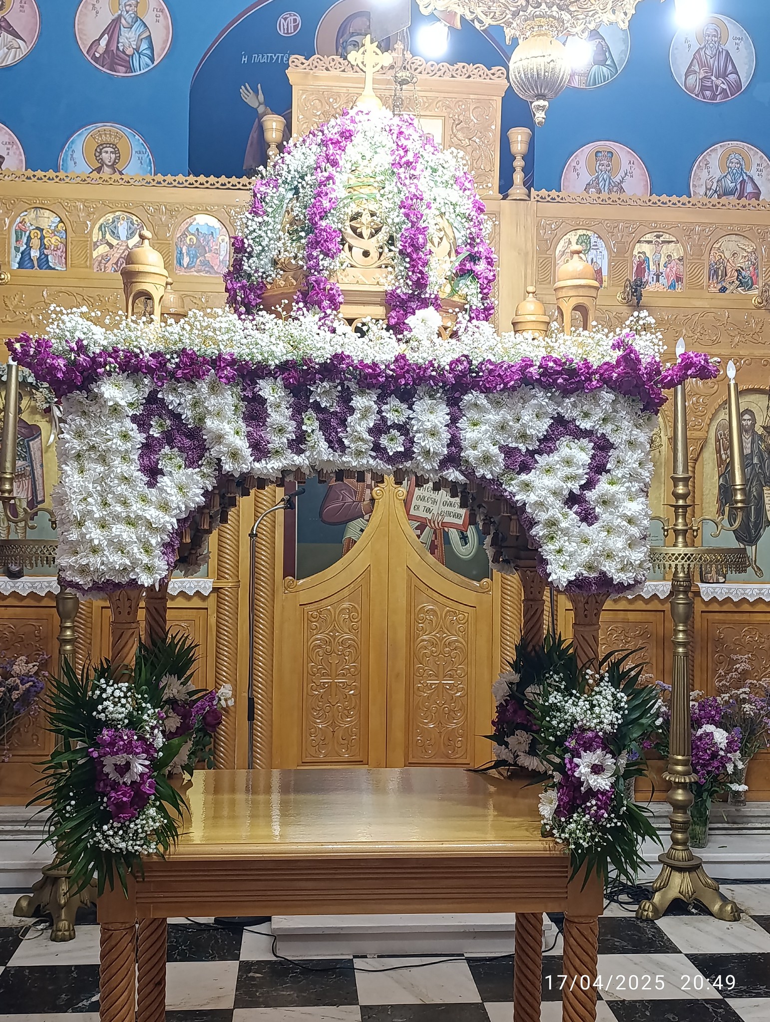 Μέσα στον ιστορικό ναό, ο επιτάφιος κοσμείται με πλούσια σύνθεση από λευκά, μωβ και λιλά άνθη, δημιουργώντας έναν θόλο ευλάβειας και τιμής για τον Εσταυρωμένο. Φωτογραφία: της ομώνυμης Facebook Page