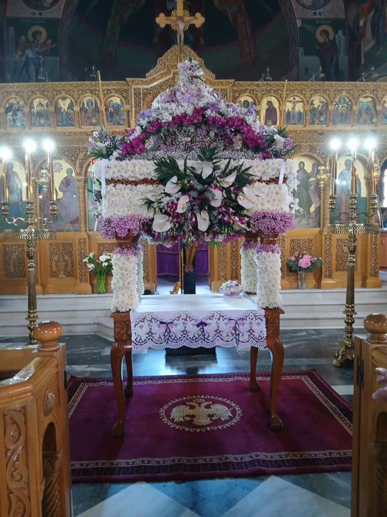 Ο εντυπωσιακός επιτάφιος του Ιερού Ναού Αγίου Γεωργίου στο Καρτέρι αναδεικνύεται μέσα από τον πλούσιο ανθοστολισμό του, που συνδυάζει λευκές και μωβ μαργαρίτες, γυψοφίλη και πράσινα φυλλώματα. – Φωτογραφία: Βιβή Φαρμάκη.