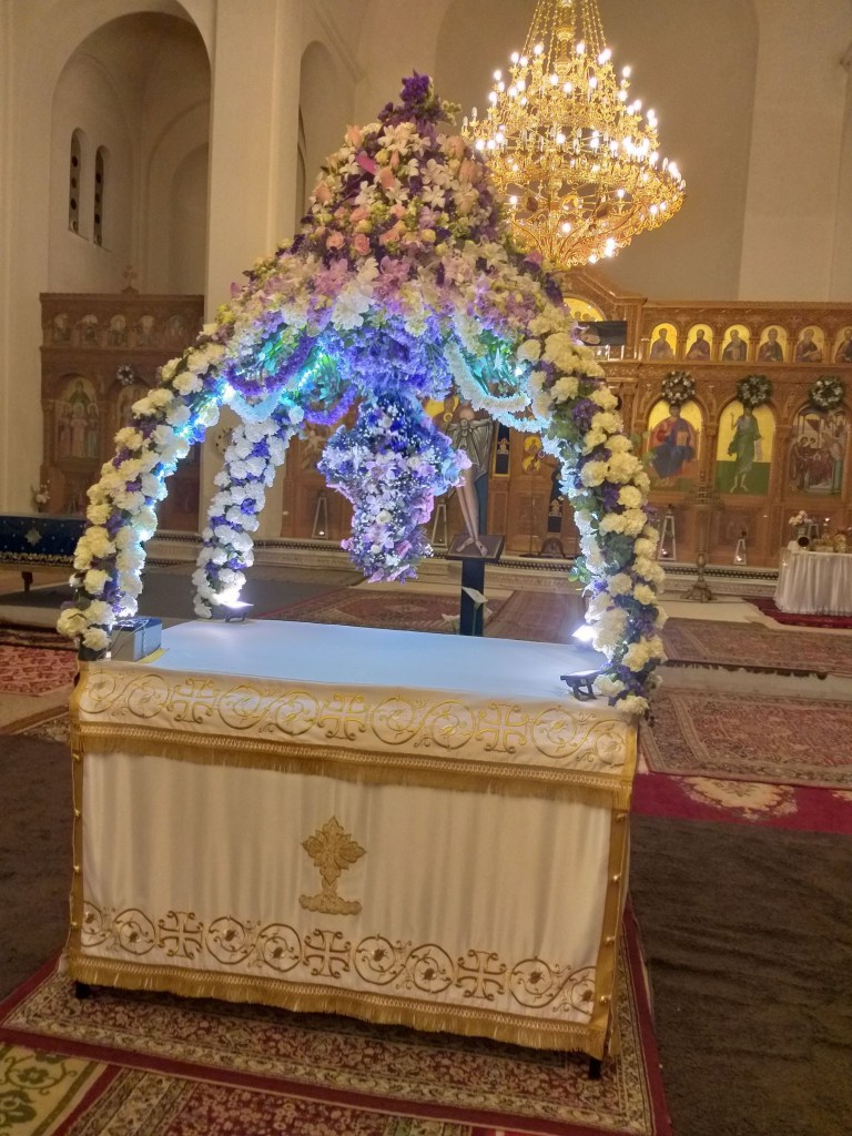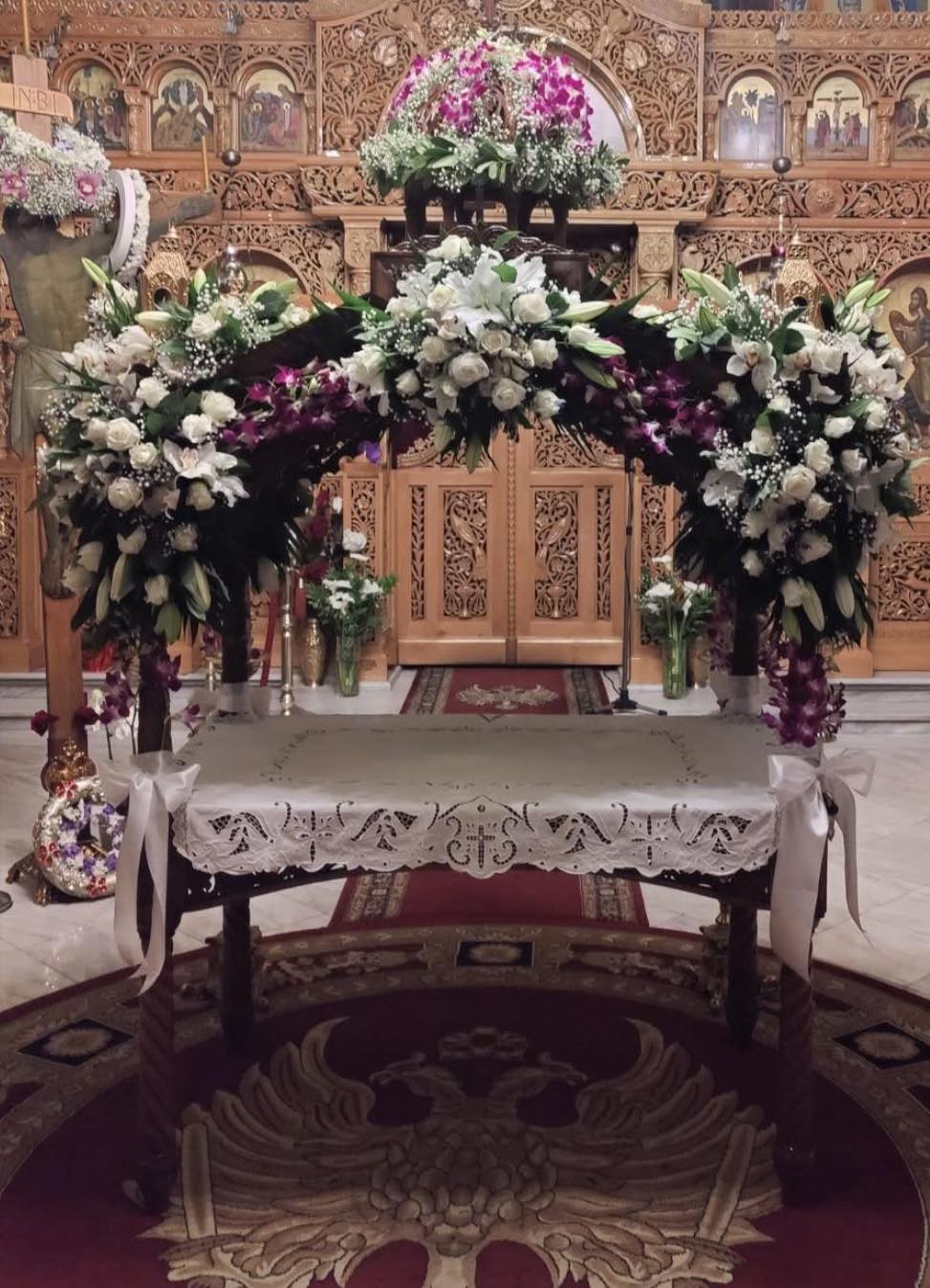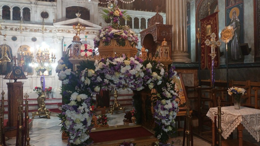 Το ξυλόγλυπτο κουβούκλιο είναι καλυμμένο με πυκνή σύνθεση από κρίνους, τριαντάφυλλα, ορχιδέες και γυψοφίλη. Η περίτεχνη δαντέλα στο τραπέζι και οι λευκές κορδέλες στις γωνίες υπογραμμίζουν τη σεμνότητα και τη μνήμη του Θείου Πάθους. Φωτο: Παναγιώτης Ραφτόπουλος