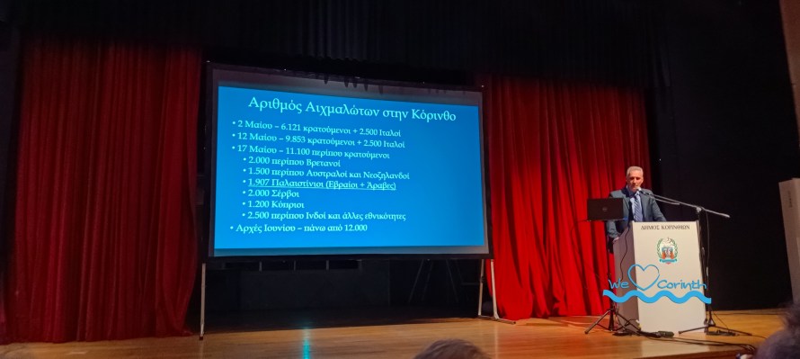 Με σπάνια ντοκουμέντα και τεκμηριωμένο λόγο, ο καθηγητής Νίκος Πουλόπουλος φώτισε άγνωστες πτυχές του στρατοπέδου Dulag 185 στην Κόρινθο.