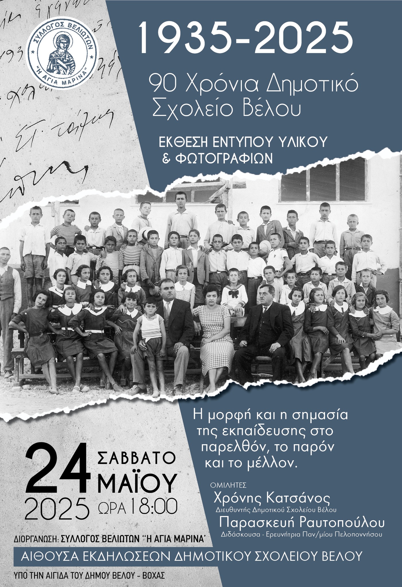Μια ξεχωριστή επετειακή εκδήλωση θα πραγματοποιηθεί το Σάββατο 24 Μαΐου 2025 στις 18:00 στην αίθουσα εκδηλώσεων του Δημοτικού Σχολείου Βέλου, με αφορμή τη συμπλήρωση 90 ετών από την ίδρυση του σχολείου. Η δράση αυτή, που διοργανώνεται από τον Σύλλογο Βελιωτών «Η Αγία Μαρίνα» υπό την αιγίδα του Δήμου Βέλου – Βόχας, φιλοδοξεί να τιμήσει την πορεία της δημόσιας εκπαίδευσης στην περιοχή, να ξυπνήσει μνήμες και να αναδείξει τη σημασία του σχολείου ως θεμέλιο της κοινωνίας.