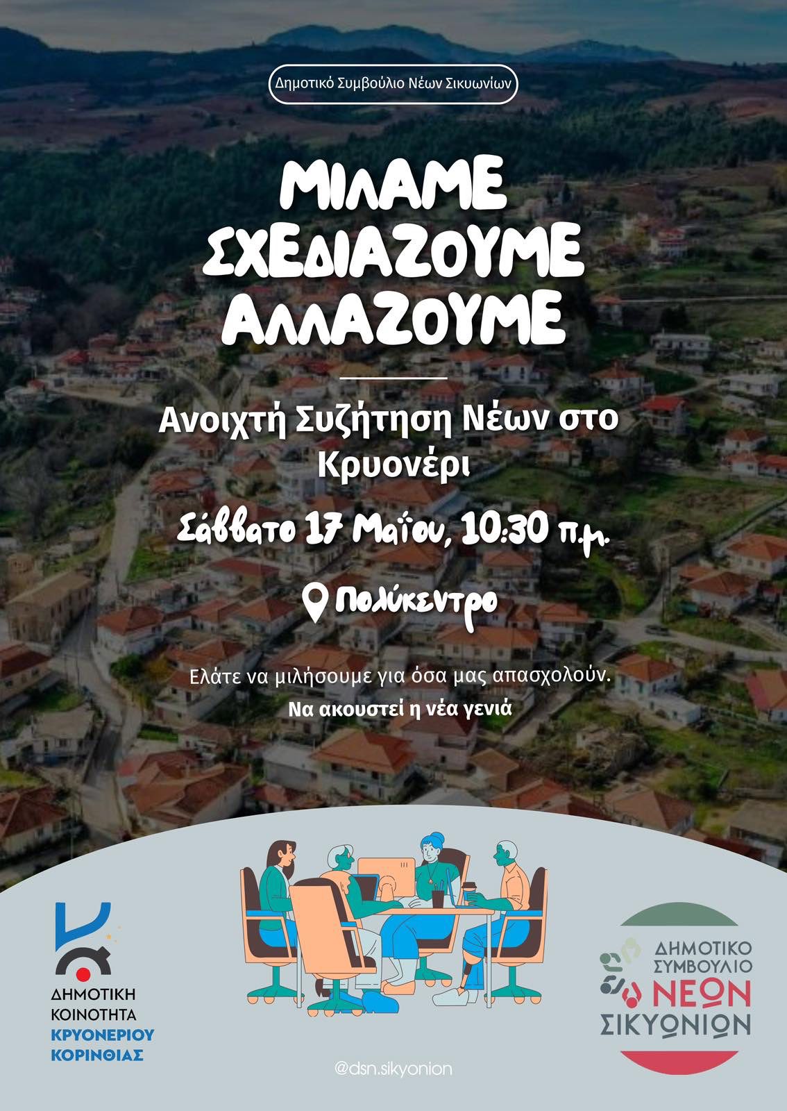 Οι νέοι του Δήμου Σικυωνίων, με πρωτοβουλία του νεοσύστατου Δημοτικού Συμβουλίου Νέων, εγκαινιάζουν τις «Ανοιχτές Συζητήσεις Νέων» ως έναν θεσμό που φιλοδοξεί να λειτουργήσει σταθερά ως βήμα έκφρασης, σύγκρουσης ιδεών, ερωτήσεων και κοινής διαμόρφωσης απόψεων και προτάσεων. Η πρώτη συνάντηση θα πραγματοποιηθεί το Σάββατο 17 Μαΐου, στις 10:30 π.μ., στο Πολύκεντρο Κρυονερίου.