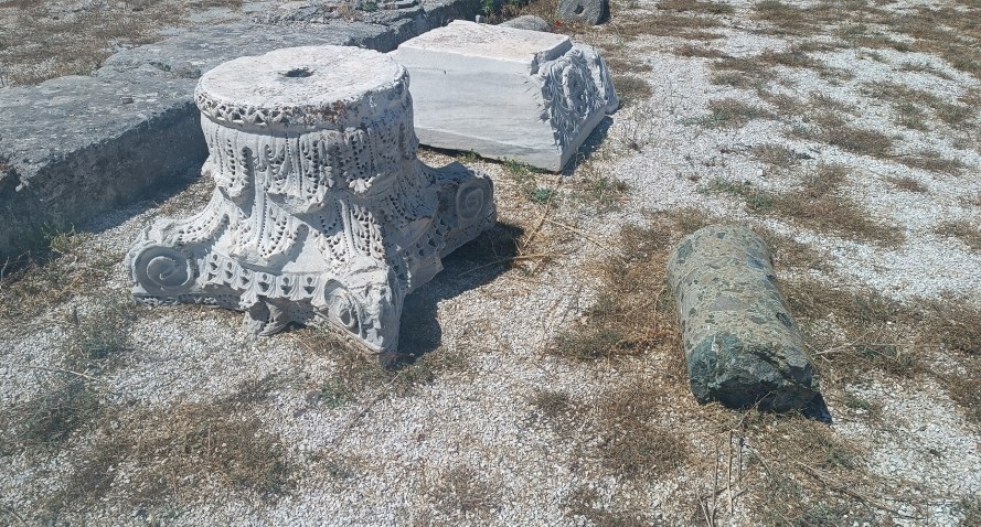 The columns are monolithic and unfluted as is usual in Byzantine architecture, with Corinthian capitals decorated with two rows of acanthus leaves, perforated to resemble lace in the Theodosian manner. These capitals appear to be original products of imperial workshops which supplied the Studios Basilica in Constantinople (453/4), the Acheiropoeitos Basilica in Thessaloniki and Basilica B at Philippi, and which were widely imitated in the early 6th century by local stonecutters too.