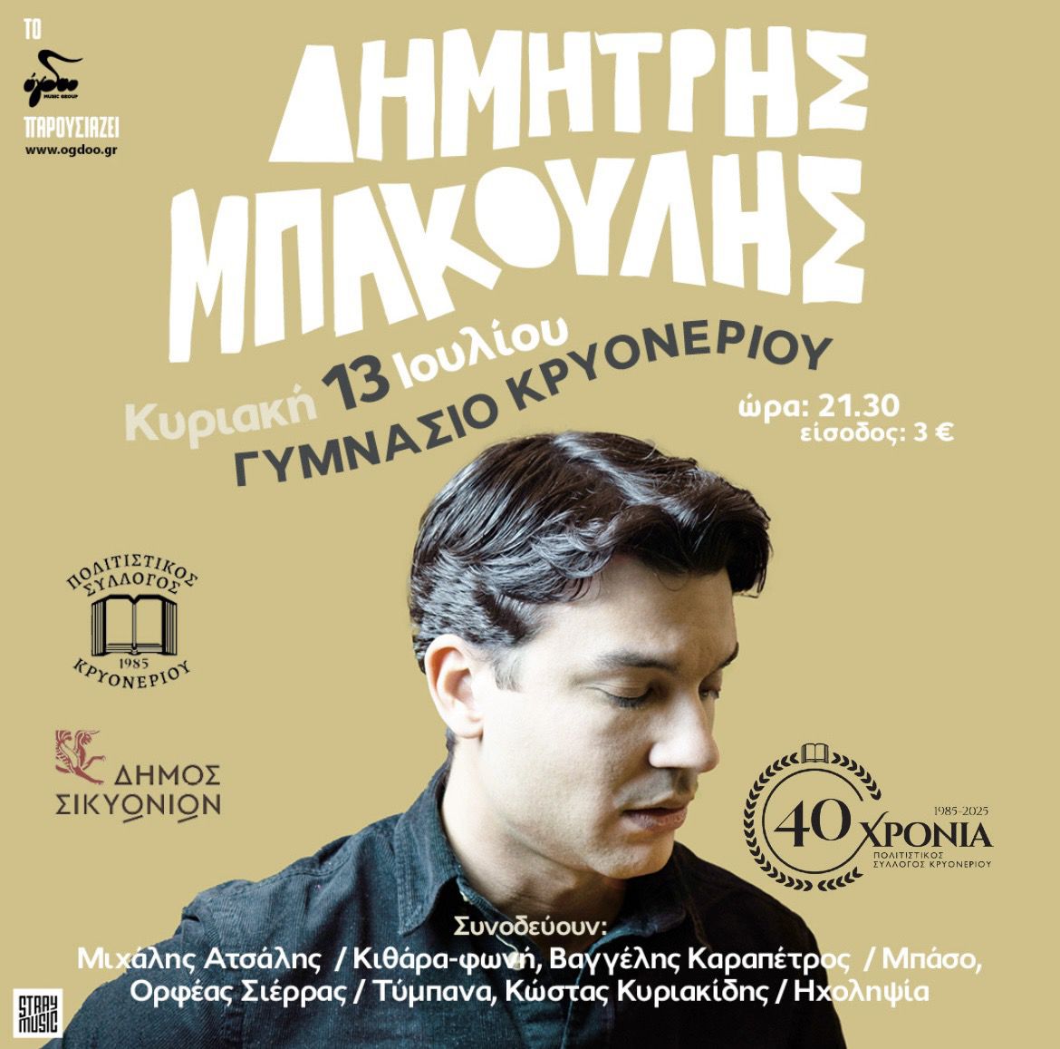 Ο Δημήτρης Μπάκουλης, ένας από τους πιο επιδραστικούς και αγαπητούς τραγουδοποιούς της νέας γενιάς, καταφθάνει στο Κρυονέρι Κορινθίας για μια μοναδική συναυλία την Κυριακή 13 Ιουλίου, στις 21:30, στον προαύλιο χώρο του Γυμνασίου Κρυονερίου. Μετά από μια σειρά sold out εμφανίσεων στην Αθήνα και την επιτυχημένη χειμερινή mini περιοδεία του ανά την Ελλάδα, ο Μπάκουλης ξεκινά τη φετινή του καλοκαιρινή περιοδεία, αυτή τη φορά με το δικό του μουσικό σχήμα και με πρώτο σταθμό την Κορινθία.