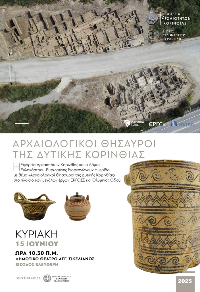 Μια σημαντική πρωτοβουλία ανάδειξης της αρχαιολογικής κληρονομιάς της Δυτικής Κορινθίας θα φιλοξενηθεί στο Ξυλόκαστρο την Κυριακή 15 Ιουνίου, με την Ημερίδα που διοργανώνουν ο Δήμος Ξυλοκάστρου – Ευρωστίνης και η Εφορεία Αρχαιοτήτων Κορινθίας, υπό την αιγίδα της Περιφέρειας Πελοποννήσου. Η εκδήλωση, με τίτλο «Αρχαιολογικοί Θησαυροί της Δυτικής Κορινθίας», θα πραγματοποιηθεί στο Δημοτικό Θέατρο “Άγγελος Σικελιανός”, με ώρα έναρξης τις 10:30 το πρωί.