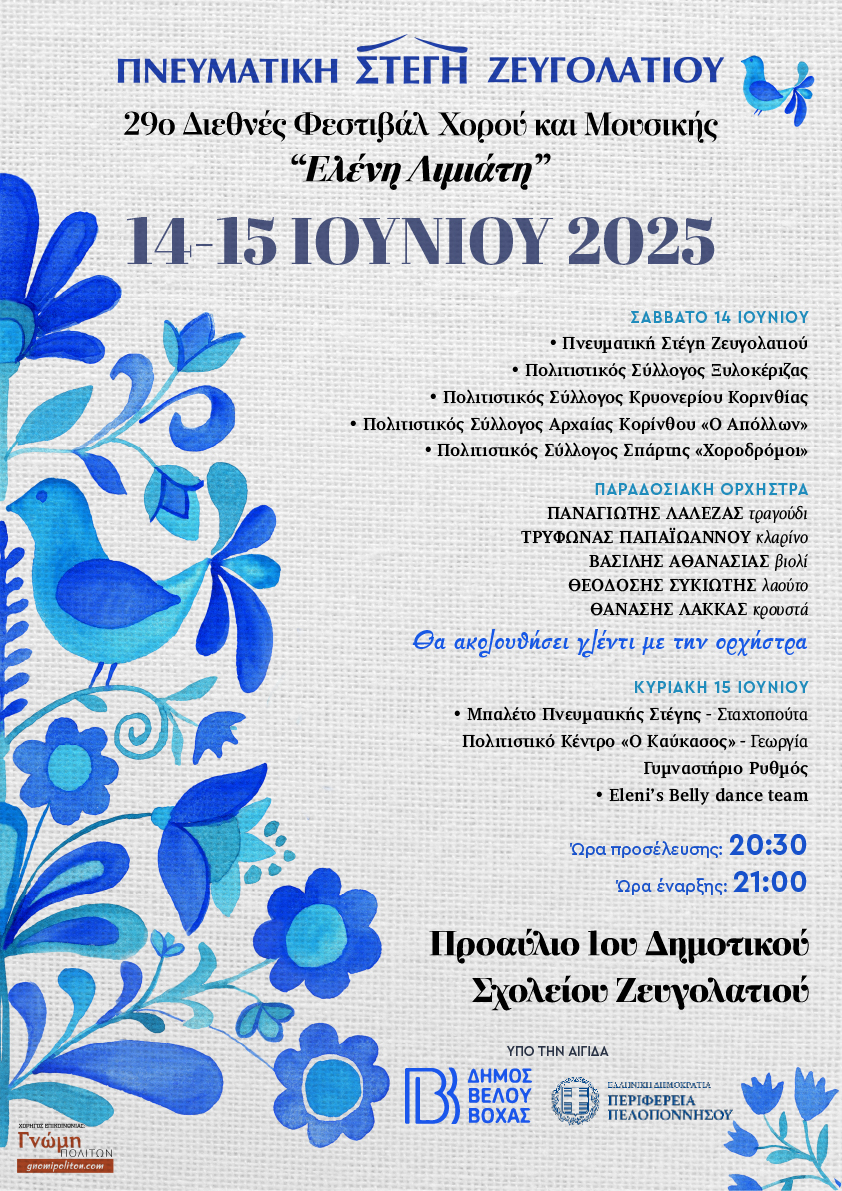 Το Ζευγολατιό ετοιμάζεται και φέτος, να φορέσει τα γιορτινά του και να υποδεχθεί το Σαββατοκύριακο 14 και 15 Ιουνίου 2025, το 29ο Διεθνές Φεστιβάλ Χορού και Μουσικής «Ελένη Λιμιάτη», μια από τις σημαντικότερες πολιτιστικές διοργανώσεις της ευρύτερης περιοχής. Το Φεστιβάλ, που φιλοξενείται στον προαύλιο χώρο του 1ου Δημοτικού Σχολείου Ζευγολατιού, διοργανώνεται από την Πνευματική Στέγη Ζευγολατιού με τη στήριξη του Δήμου Βέλου-Βόχας και της Περιφέρειας Πελοποννήσου.
