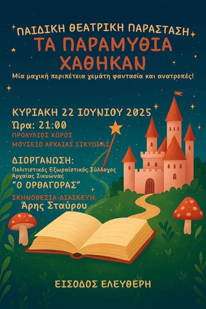 Ο Πολιτιστικός Εξωραϊστικός Σύλλογος Αρχαίας Σικυώνας «Ο ΟΡΘΑΓΟΡΑΣ» διοργανώνει την παιδική θεατρική παράσταση «Τα παραμύθια χάθηκαν», αύριο Κυριακή 22 Ιουνίου 2025, στις 21:00, στον προαύλιο χώρο του Μουσείου Αρχαίας Σικυώνας.